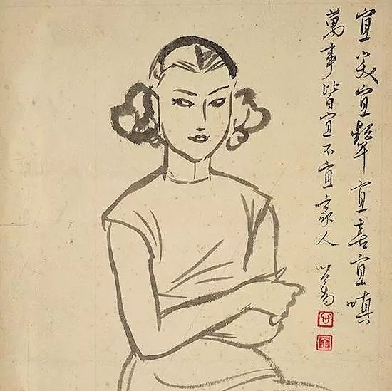 他的漫画诙谐犀利,如《不宜家人》里画着一个身着旗袍的女子,