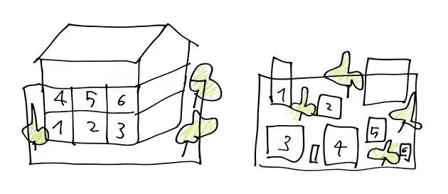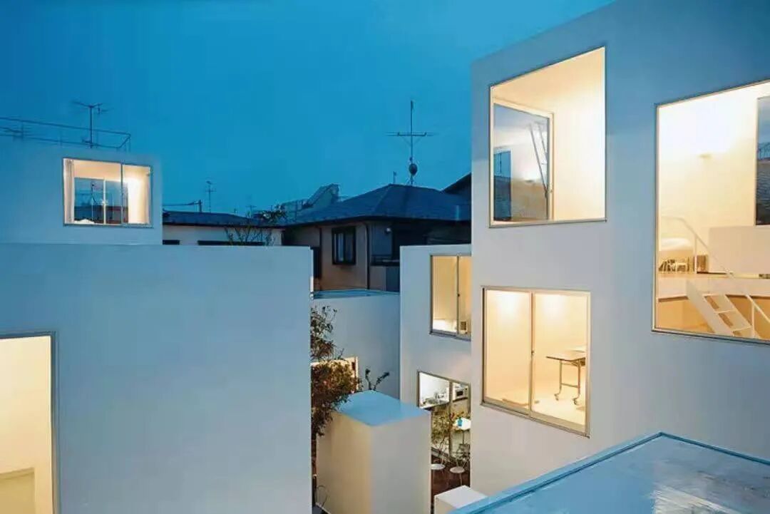 由西泽立卫事务所设计的森山邸(mariyama house)则同样改变了传统的住宅空间构成,10个高低不同的方盒子错落地分布在基地中,各具特色和用途。在共享相邻院落的同时又各具独立性,居住抑或出租,业主有充足的决定权去建立“自己理想的生活方式”。