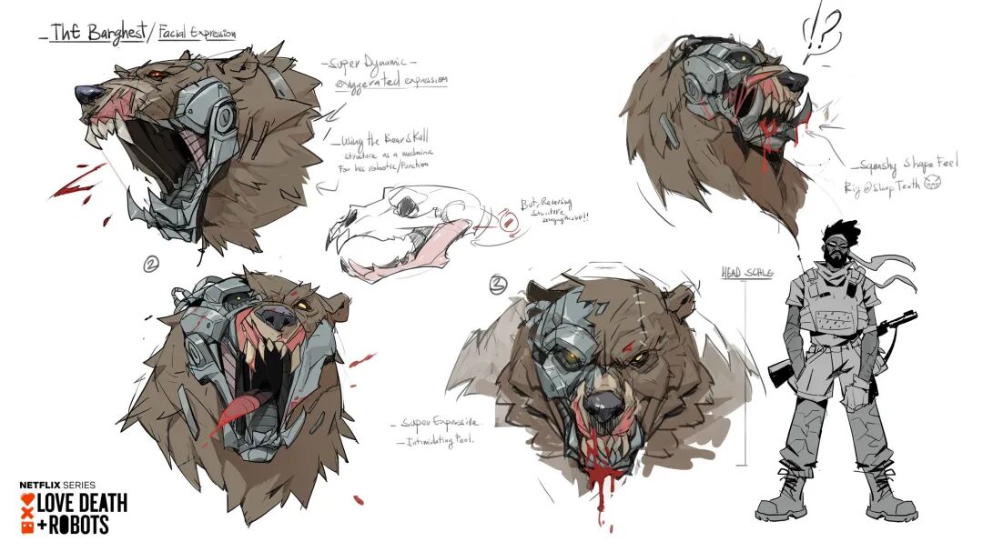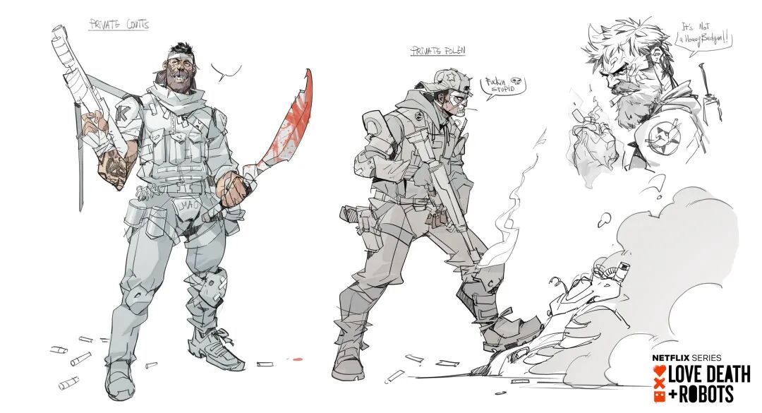 今年再次引起全球热议的《爱死机》系列第三季中,Hicham Habchi同样也有参与,他负责为充满美式漫画风格的《杀戮小队开杀》这一集创作部分角色概念设计,线条还是一如既往地简洁充满张力。