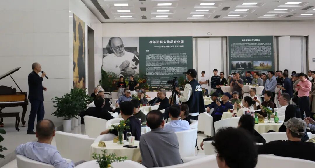 中国文联副主席、中国油画学会会长、浙江省文联主席、中国美院教授许江致辞,赏析梅尔尼科夫的多件作品,称他是大家的前辈、偶像、永远的朋友。“他的画向我们诉说了绘画崇高性,这种崇高性深深地养育了我们,一直到今天我们画主体性绘画,我们心里都有种腾然升起的崇高感。”