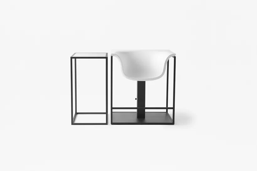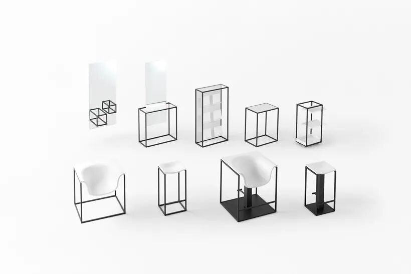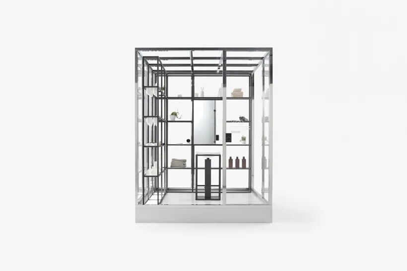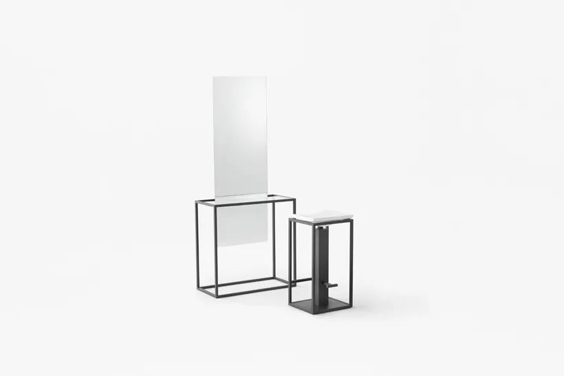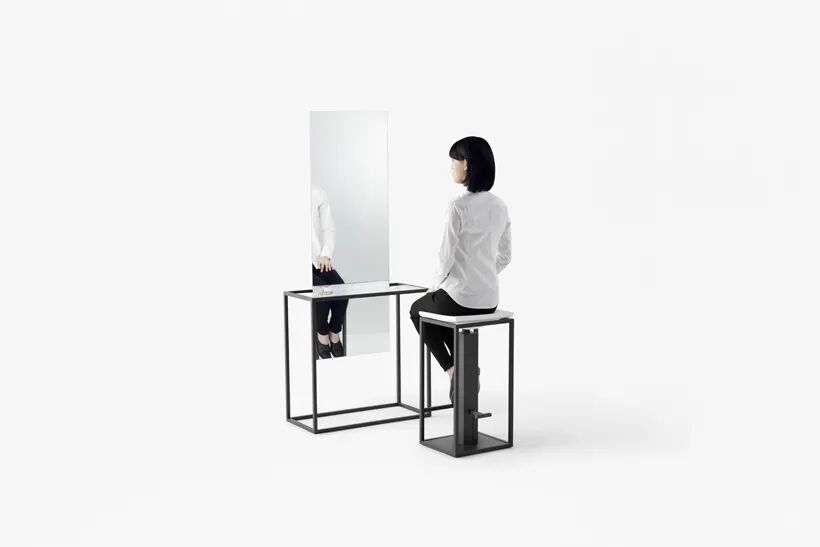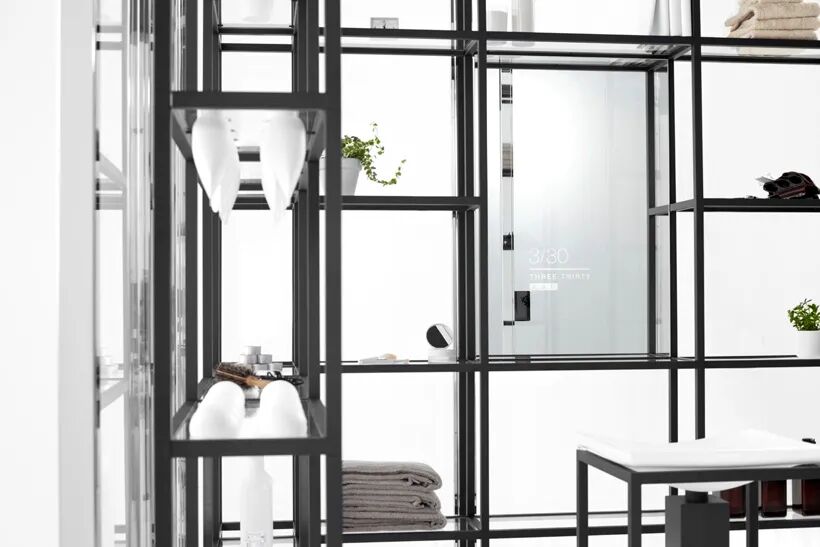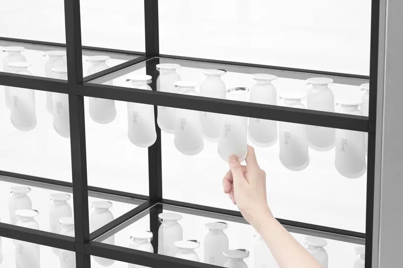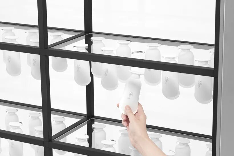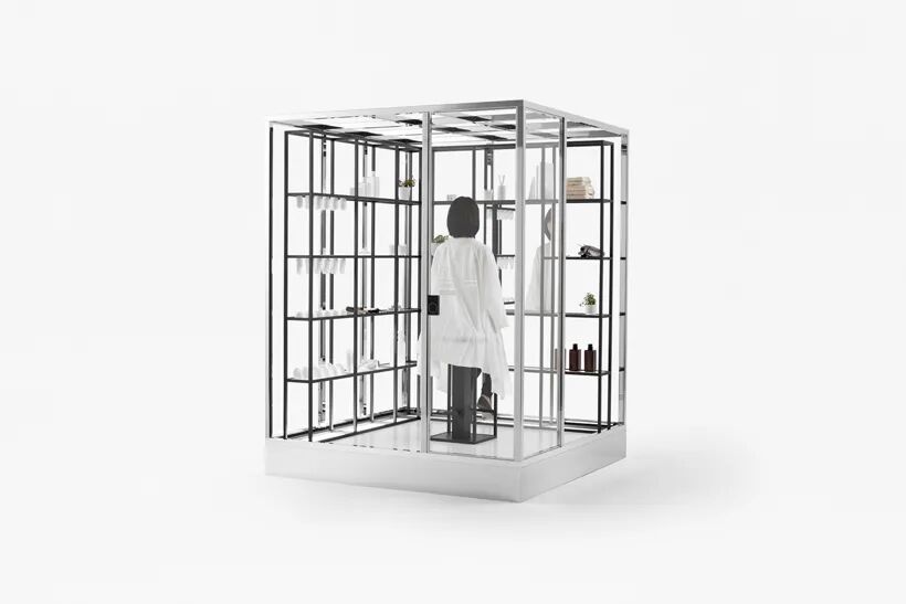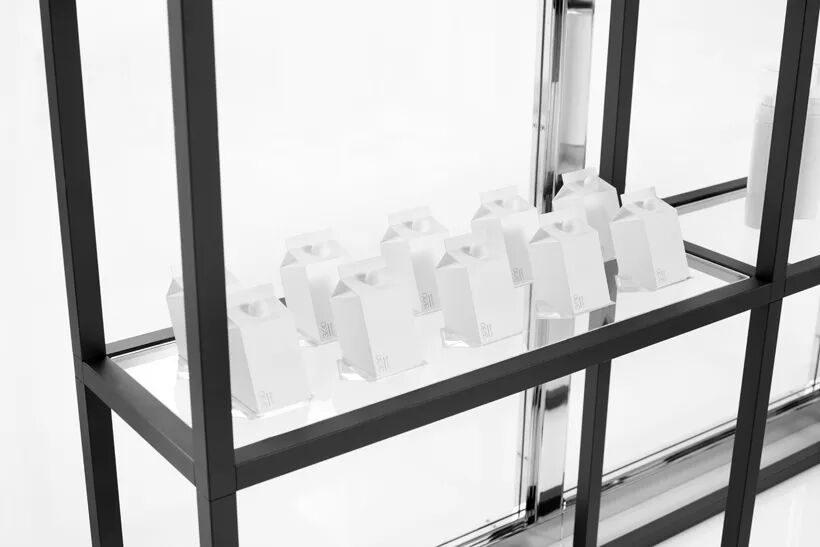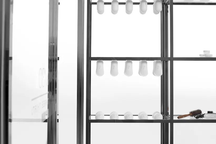 第一个特点是一个紧凑的1.8万平方英尺的工作隔间,使美容师可以为每位顾客提供单一功能的服务。这些单元在设计时考虑了安装地点,比如在发廊的角落,或者在火车站或购物中心内,预先注册的美容师可以免费使用。可以在网上预订,只要把智能手机放在设备上,就可以进行预订和支付。其次,由于这项服务的长度只有30分钟,钢框架被用来创造一种漂浮的临时感觉,使它们能够融入任何类型的空间。椅子、镜子、马车和架子都使用了19毫米的钢框架,以创造这种效果。由于治疗时间短,采用了台凳式椅子。因此,可以在检查全身平衡的同时进行治疗。对于发廊用的化妆品,如洗发水、护发素和各种发型用品,都是用容器来装3周内用完的量,并且产品的新鲜度是非常重要的。这样做的目的是创造一个新的周期,鼓励顾客在化妆品用完后去美发沙龙。化妆品容器的设计让人联想到新鲜的食品,例如牛奶,容器被陈列在专门的货架上,创造出一种特殊的信息,即它们只能在这种类型的发廊购买。
