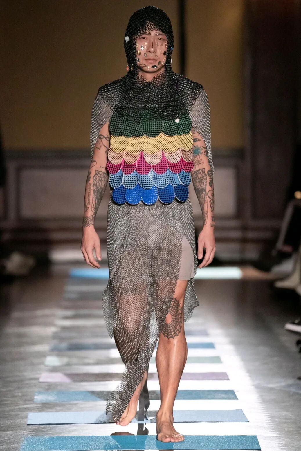 Puppets and Puppets作为时尚DIY品牌小圈子的一员,最破圈的可能就是滩在内衣上的两朵蛋,还有极尽洛可可装饰性的设计细节,对于回收物品,设计师物尽其用后,将透视PVC和树脂再设计与服装和鞋品结合。