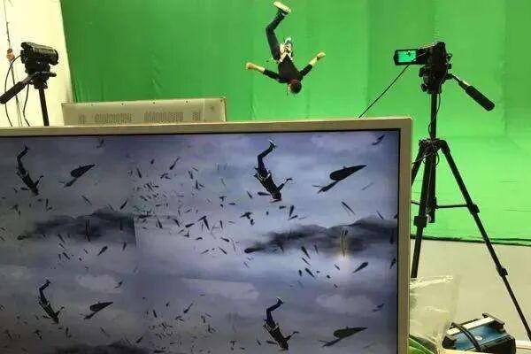 这点让我百思不得其解,后来群友说有可能室内场景采用的是绿幕技术(如下图)。