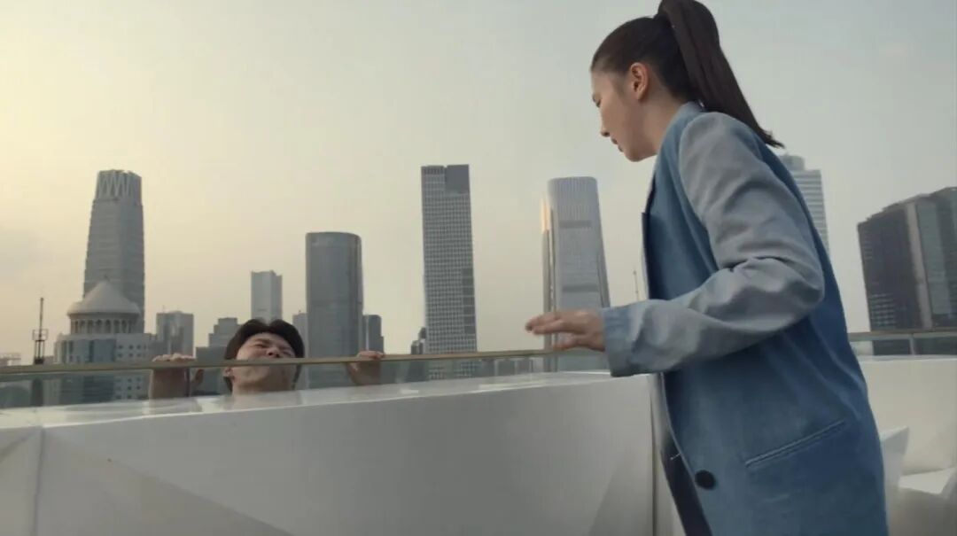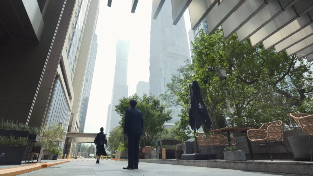 但是有个场景里出现了公司屋顶的天台,与前面的分析不太符合。如上图所示,最左侧的塔楼是国贸大厦A座边上的塔楼——北京新国贸饭店。如果我们前面的分析没错,那天台就不可能出现在这个画面里。