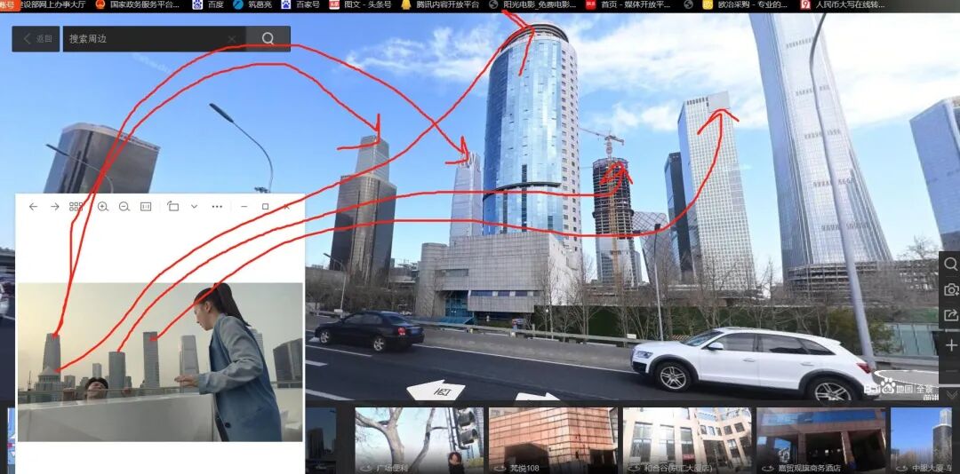 我从几个楼的对位关系分析,发现这个场景在国贸大厦A座的东南方向,恰巧是梵悦108的位置,而巧合的是我还写过一篇文章介绍过这个项目。(如下图)