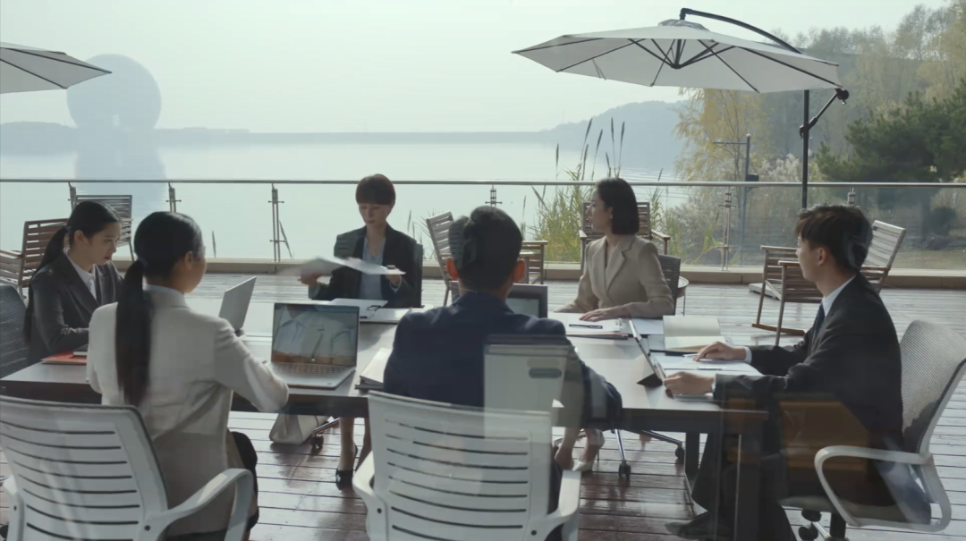 男二号宋嘉辰的公司——天伦乾坤(剧照如上图)。乍看入口的样子,我第一个感觉是个售楼处或者会所的感觉。其实它是在北京怀柔雁栖湖某个别墅里取的景。