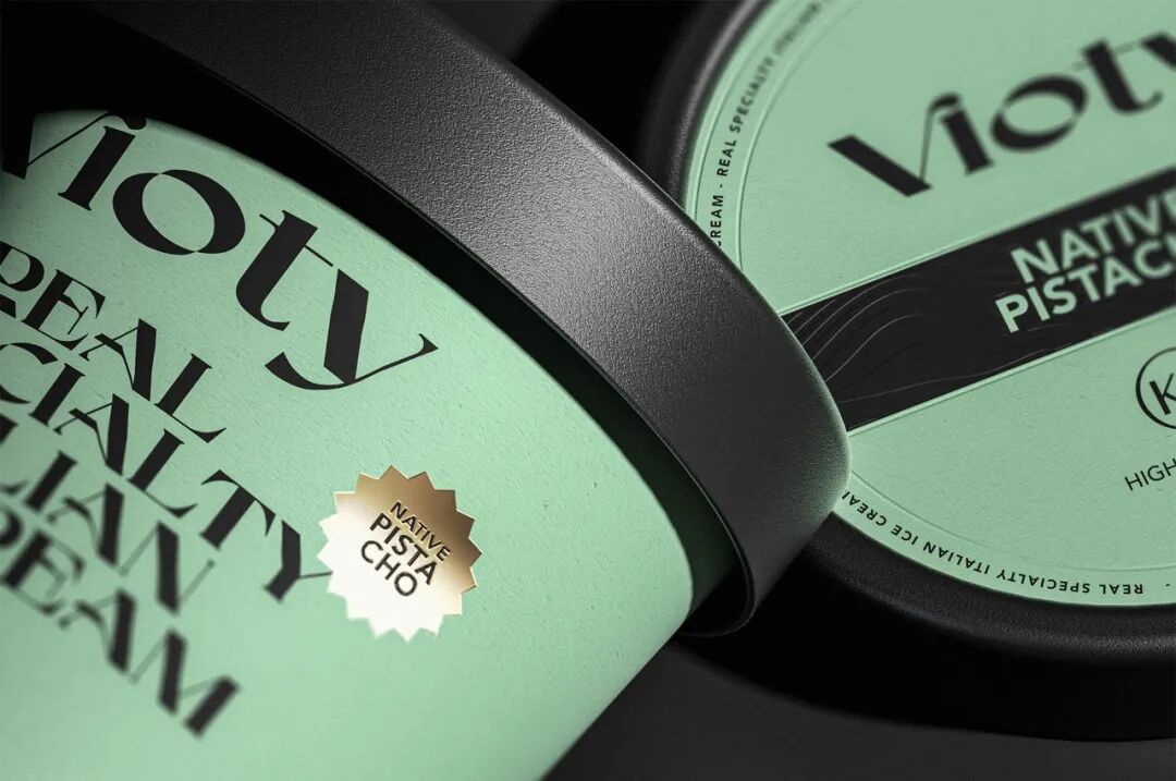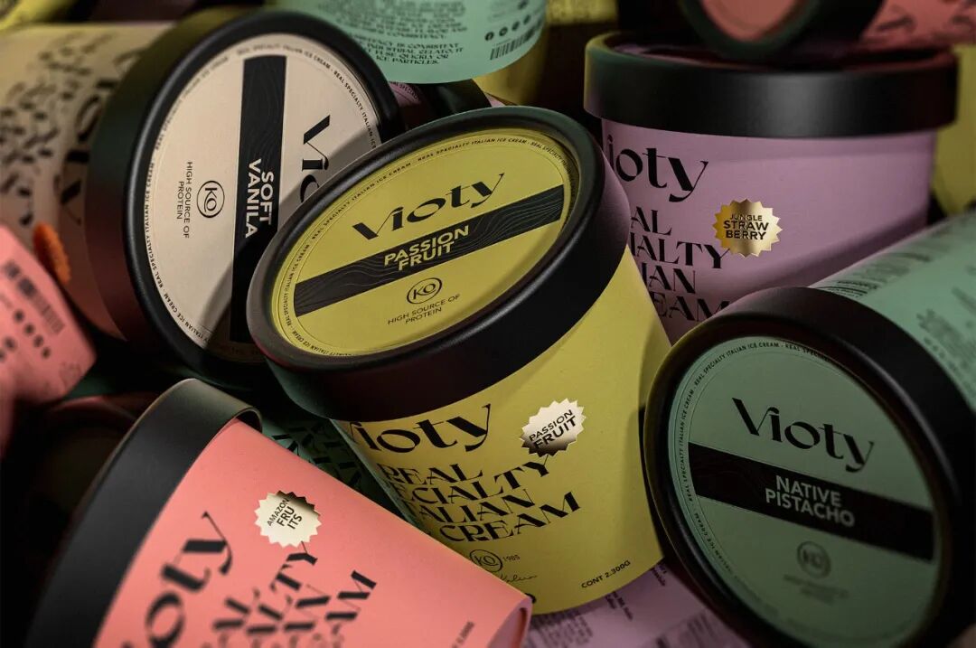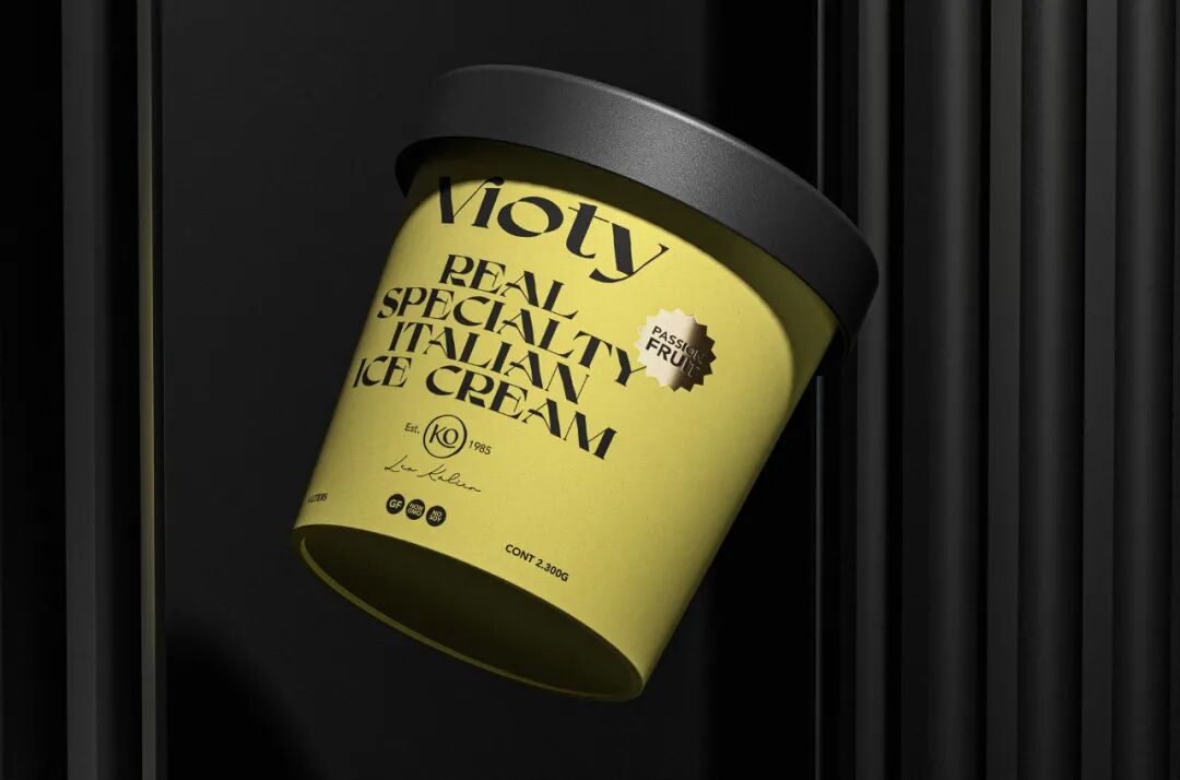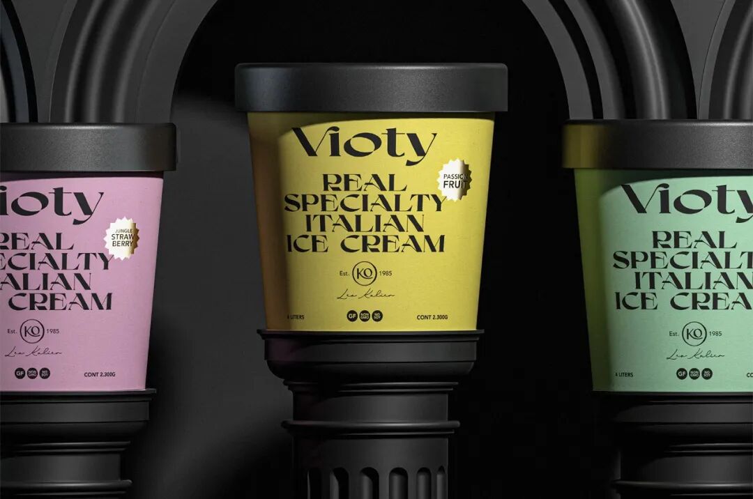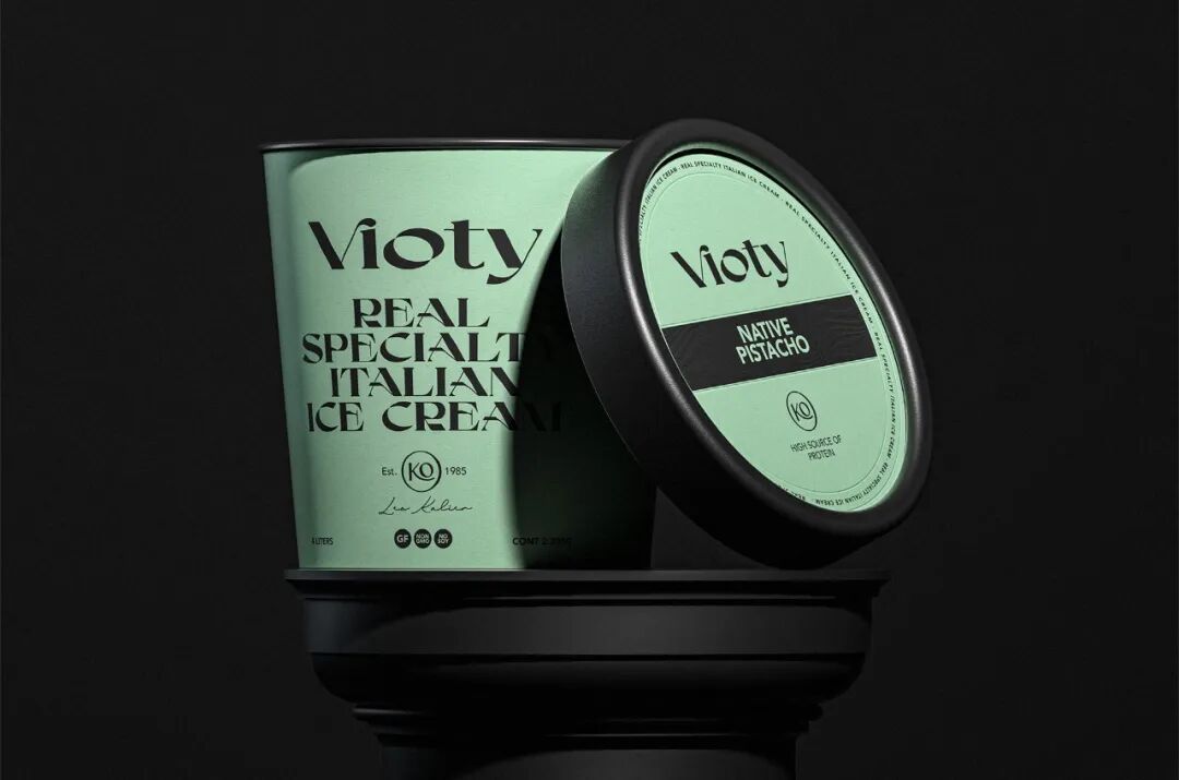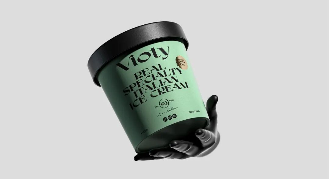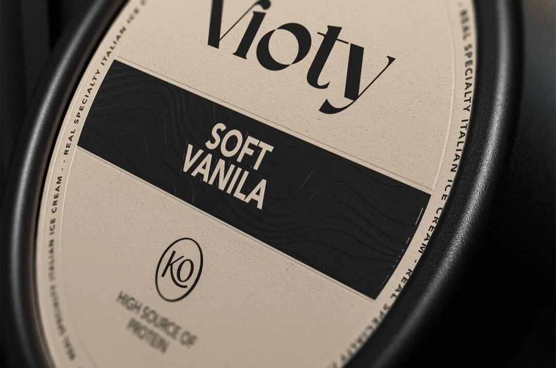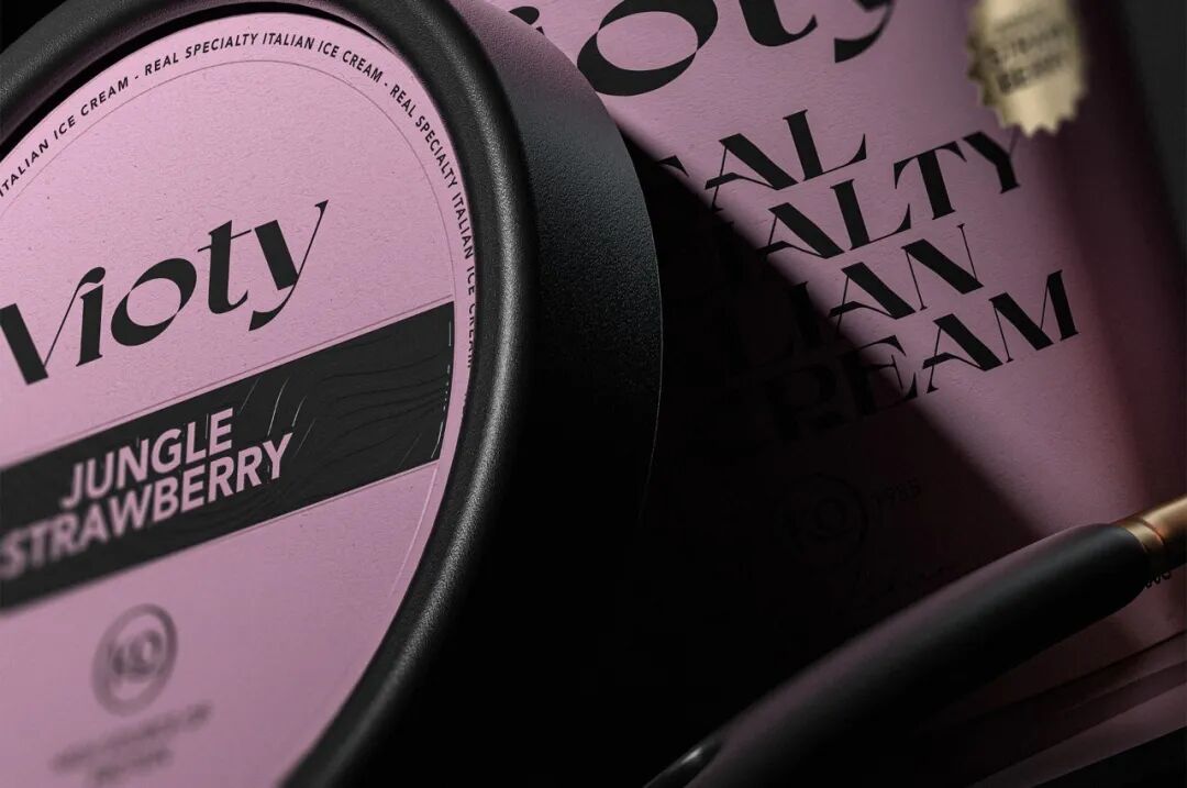 为手工制作和更天然的冰淇淋的产品创造一个品牌和包装,从VIDA这个词衍生出VIOTY品牌的名称,然后转移到标志上,该标志由一个非常有表现力和经典的字体组成,用非常醒目的平面颜色和黑色的大文本加强了这个概念,形成了一个强大的对比,并伴有小的金色细节,实现一个经典和精美的包装。