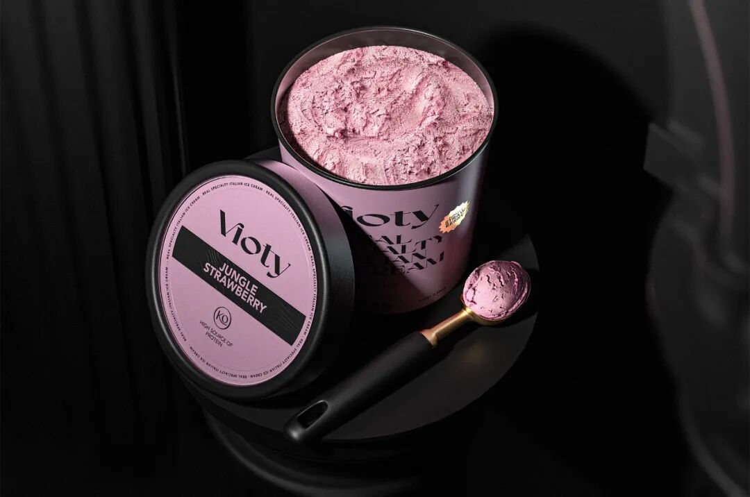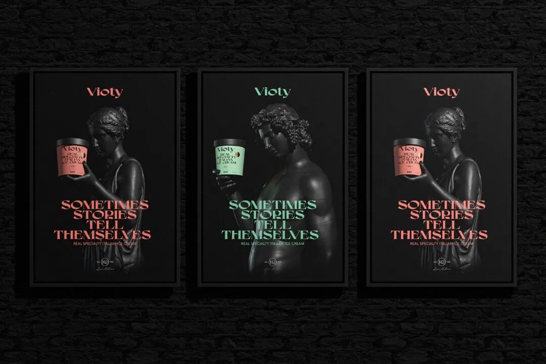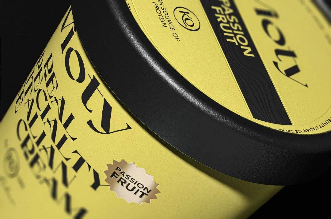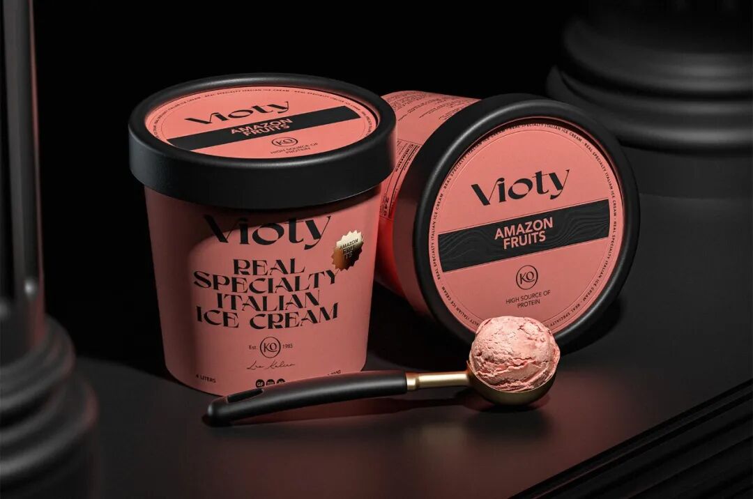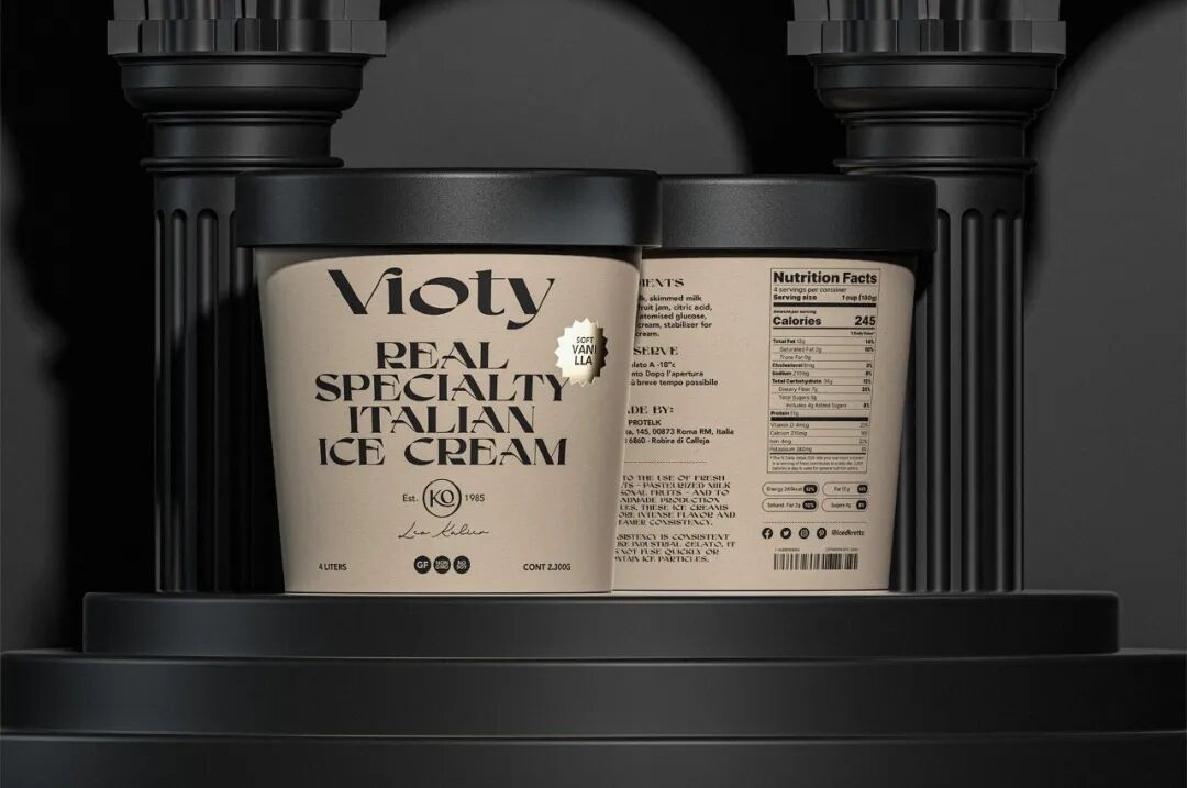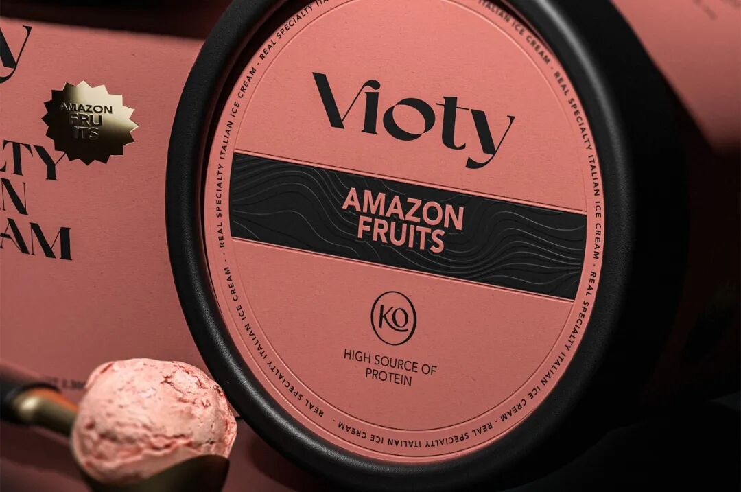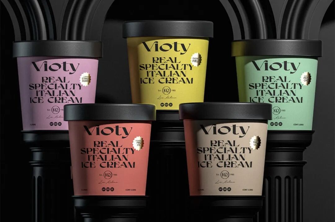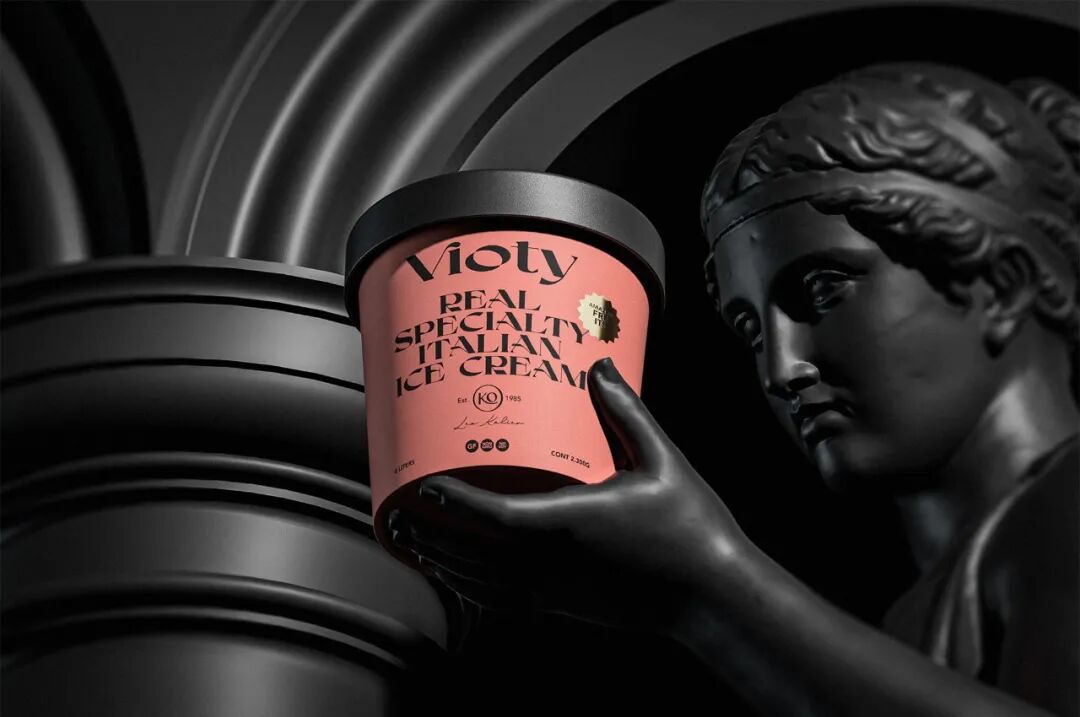为手工制作和更天然的冰淇淋的产品创造一个品牌和包装,从VIDA这个词衍生出VIOTY品牌的名称,然后转移到标志上,该标志由一个非常有表现力和经典的字体组成,用非常醒目的平面颜色和黑色的大文本加强了这个概念,形成了一个强大的对比,并伴有小的金色细节,实现一个经典和精美的包装。