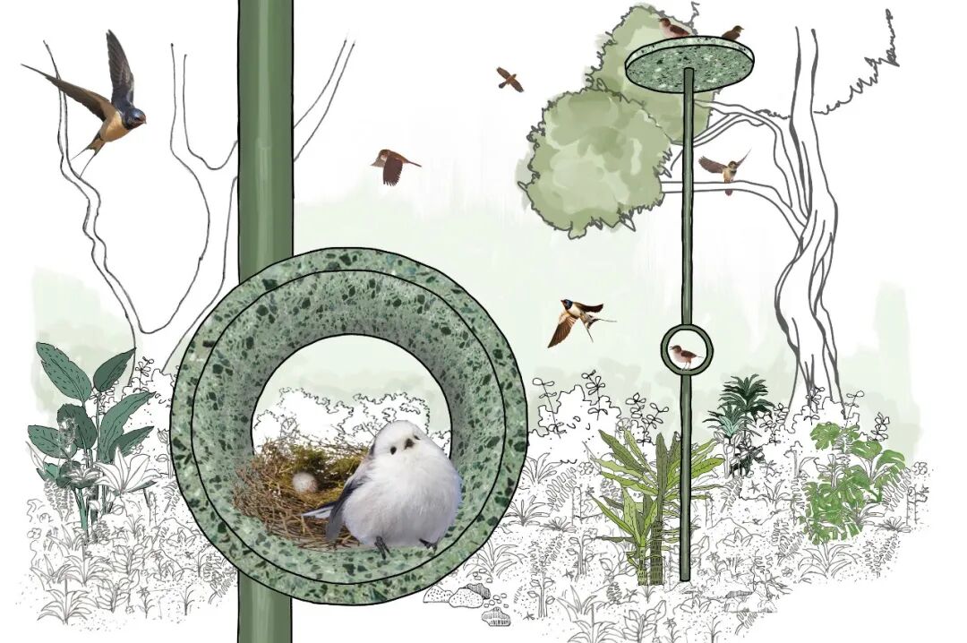 「Bug as food as house」鸟巢的灵感来自于鸟吃虫子。它似乎又像一个肥胖的大虫,准备捕食落入的飞鸟。