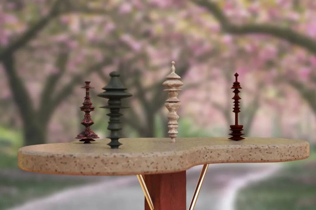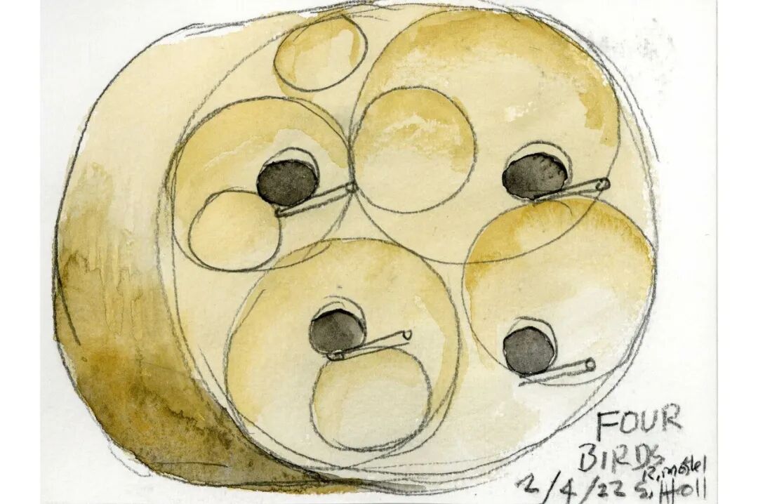 「Four Birds」(四只鸟)的灵感来自于法国作曲家Olivier Messiaen的第一首作品“Le Merle Noir” (黑鸟)。这个音乐汇聚了Messiaen作曲的主要思想,由四种排列形式的鸟鸣组成。「Four Birds」由枫木制作而成,圆柱体上有四个圆形入口,四种不同的旋律。