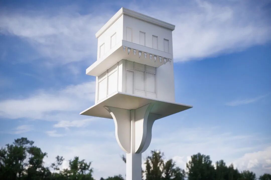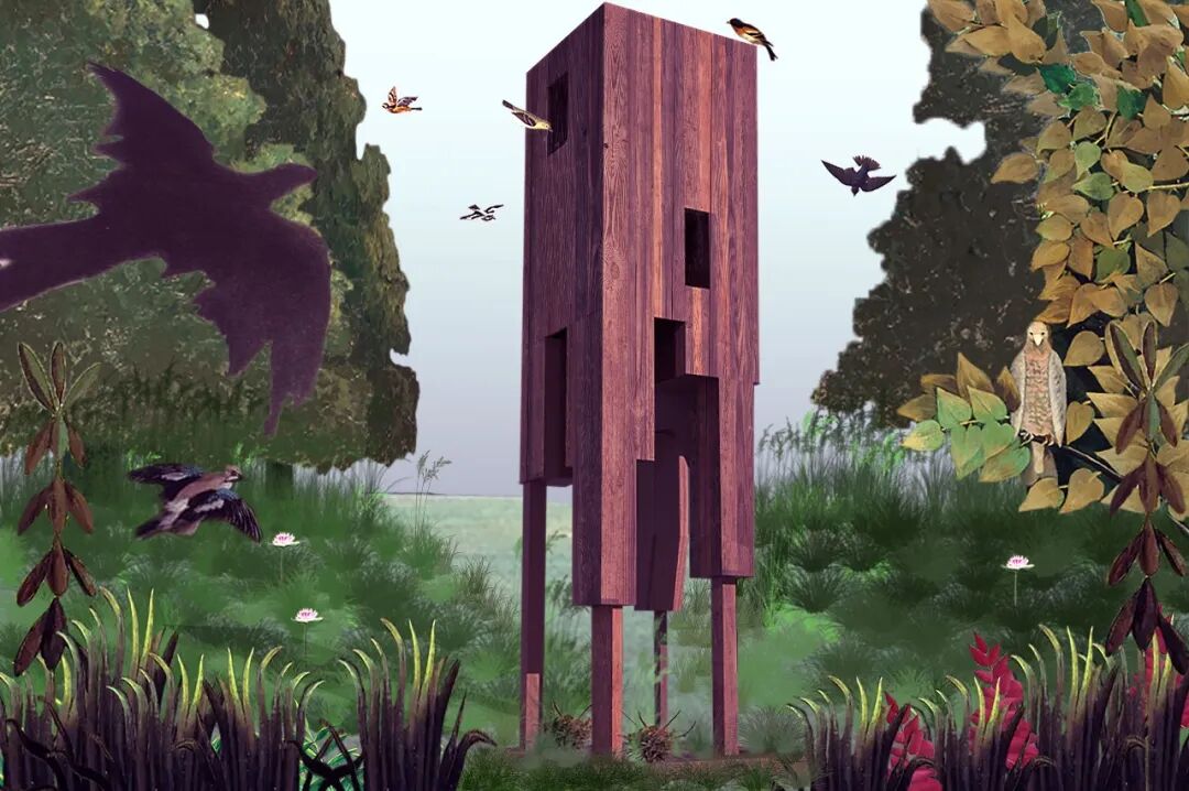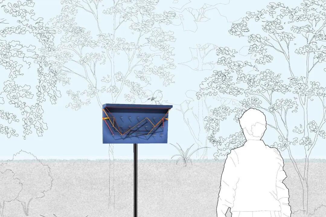 艺术家安迪·霍尔顿决定超越鸟舍,创建一个鸟类雕塑。霍尔顿受到世界上一些最濒危鸟类的启发,录制了它们的歌曲,并将波形转化为雕塑。其中四座雕塑矗立在一个平台上,代表了南岛kōkako、加利福尼亚秃鹰、细长喙鹬和苏鲁犀鸟的歌声。