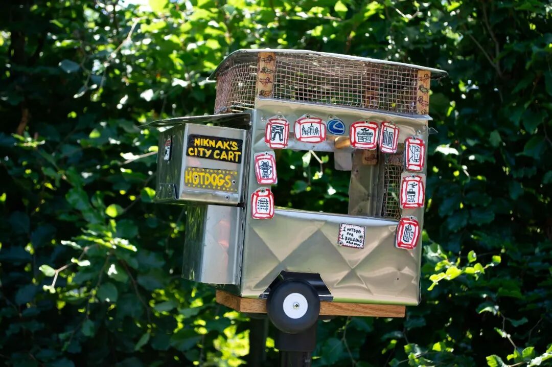 将热狗车等人类建筑微缩到鸟巢的大小。“我希望观众能欣赏到鸟类在多大程度上适应人类建造的建筑,并从中受益。”
