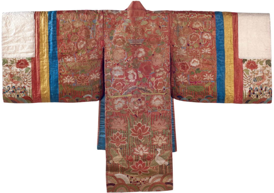 阔衣可以在多场婚礼中反复使用,每次只需更换用白纸做成的衣领和袖口衬里。如同多数传世品一样,布鲁克林博物馆所藏阔衣上有多处修补痕迹,如丝线缝补,将一朵刺绣牡丹作为补丁修补破损,以及更换整块面料。