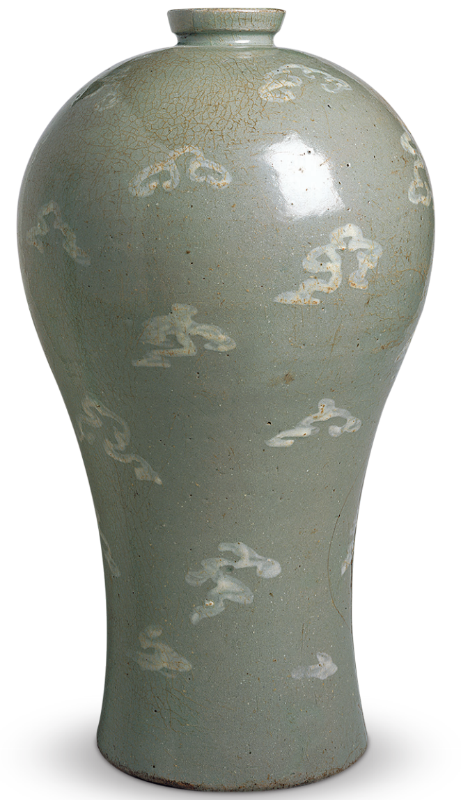 此梅瓶器表用白色化妆土绘制了祥云,营造出洇染和流动的效果。如同阴刻莲瓣纹执壶上的白点装饰,手绘图案在朝鲜青瓷的历史中流行的时间很短。
