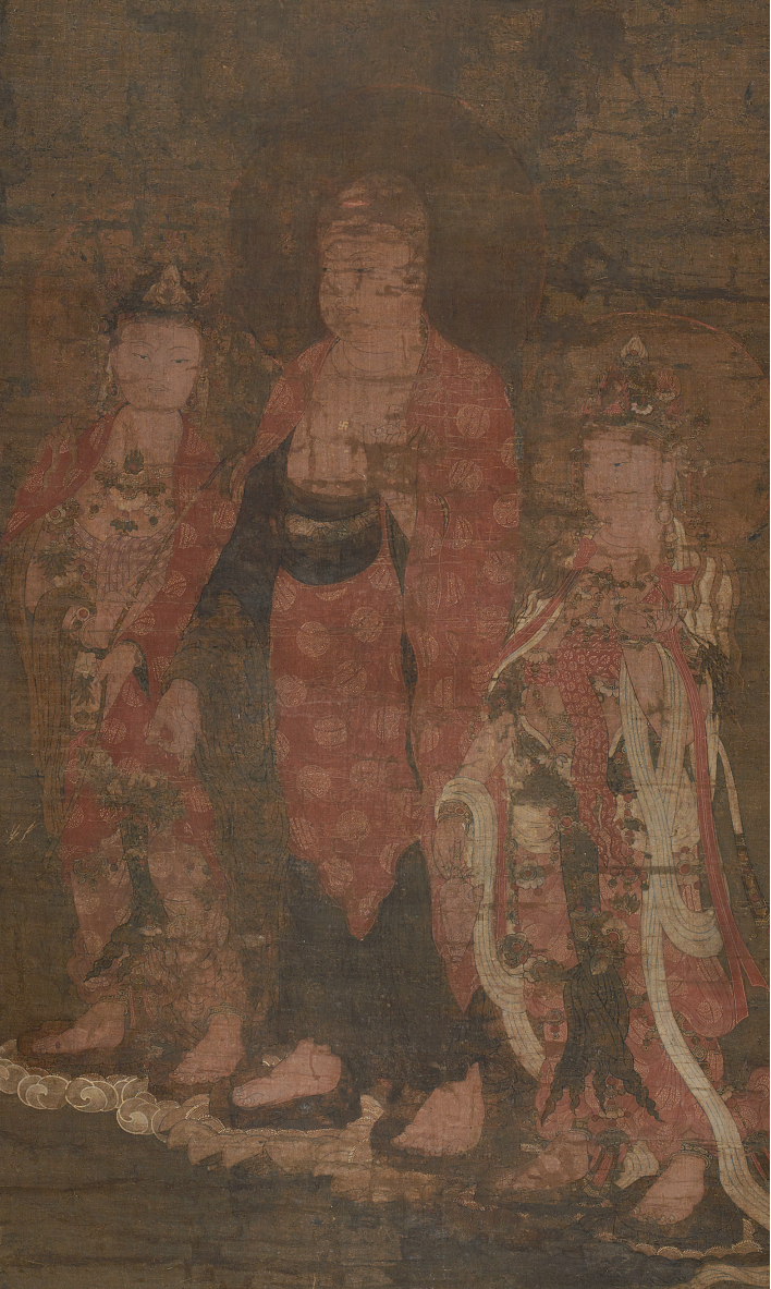 它描绘了阿弥陀佛、观世音菩萨与大势至菩萨从西方净土降临,迎接虔诚往生者灵魂的场景。