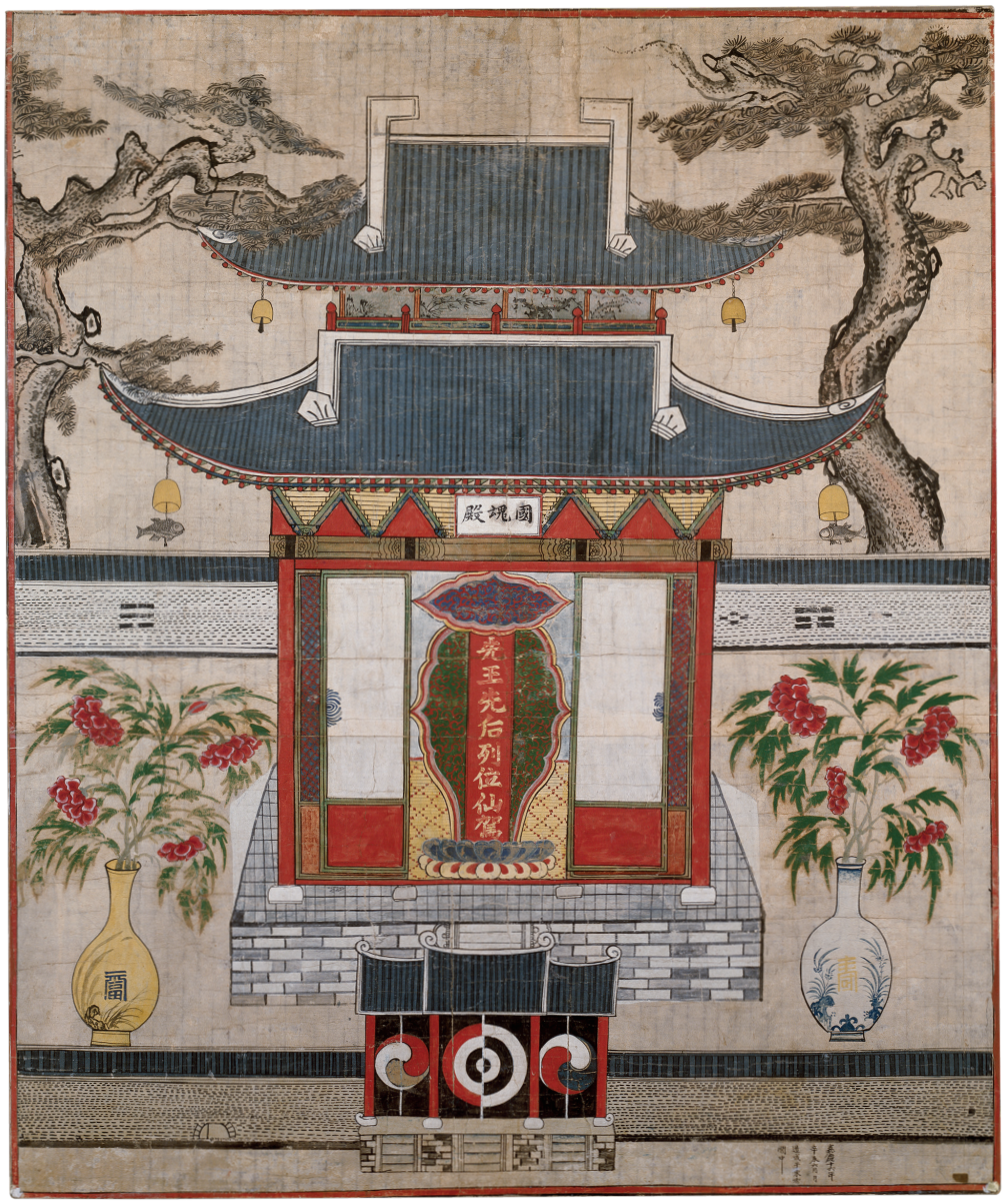 画面中部装饰华丽的牌位上书写着:“先王先后列位仙驾”,画像右下角的题款显示该画像曾悬挂于“东香阁”中,可能是一处宫廷建筑。