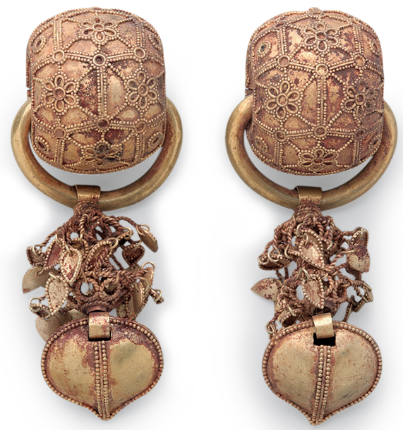耳环装饰华美,采用了黄金造粒工艺手法。此技术起源于古代中东和古代地中海地区,后来沿丝绸之路向东传入亚洲。