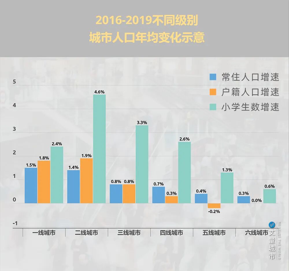 上图为根据恒大研究院2020年8月公布的《中国人口大迁徙的新趋势》数据所制作的不同等级城市的人口年均变化情况。可以看到县级市及县(五、六线城市)是人口增长最低的城市。