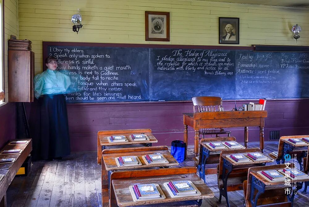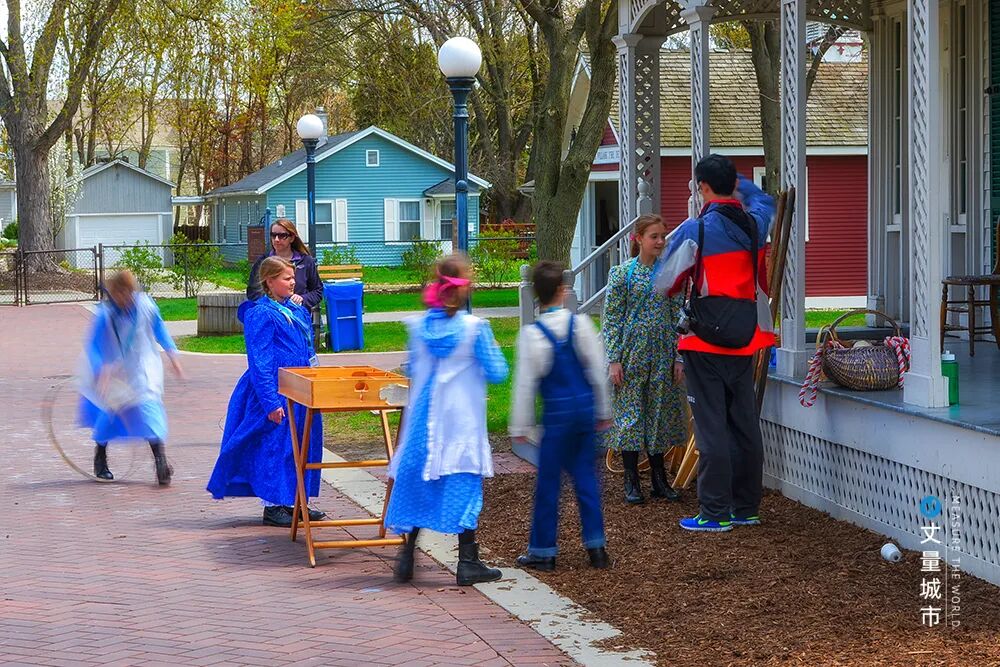 营地中仿照北美早期移民的村落,搭建有商店、教室、铁匠作坊等建筑。营地中有专门的工作人员穿着传统服装扮成当时的人物,演示当时的场景。