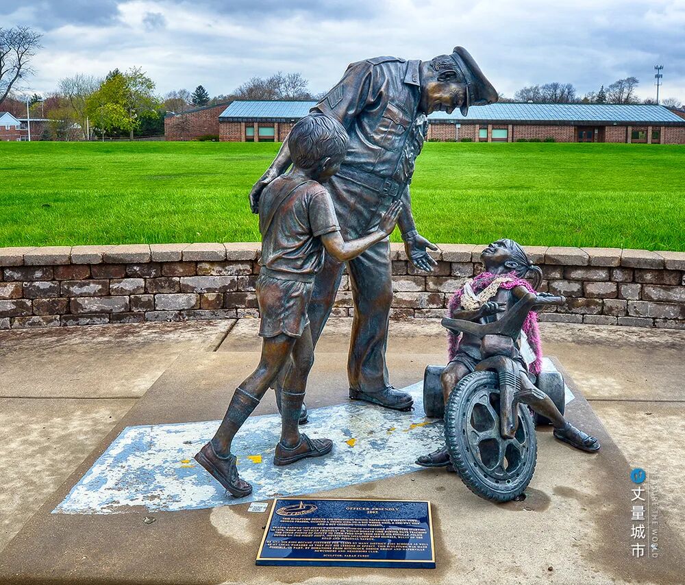 内珀维尔设有专门的儿童警察,并且设置有一个警察拉着两个孩子的城市雕塑,显示出城市始终把儿童的安全放在第一位。