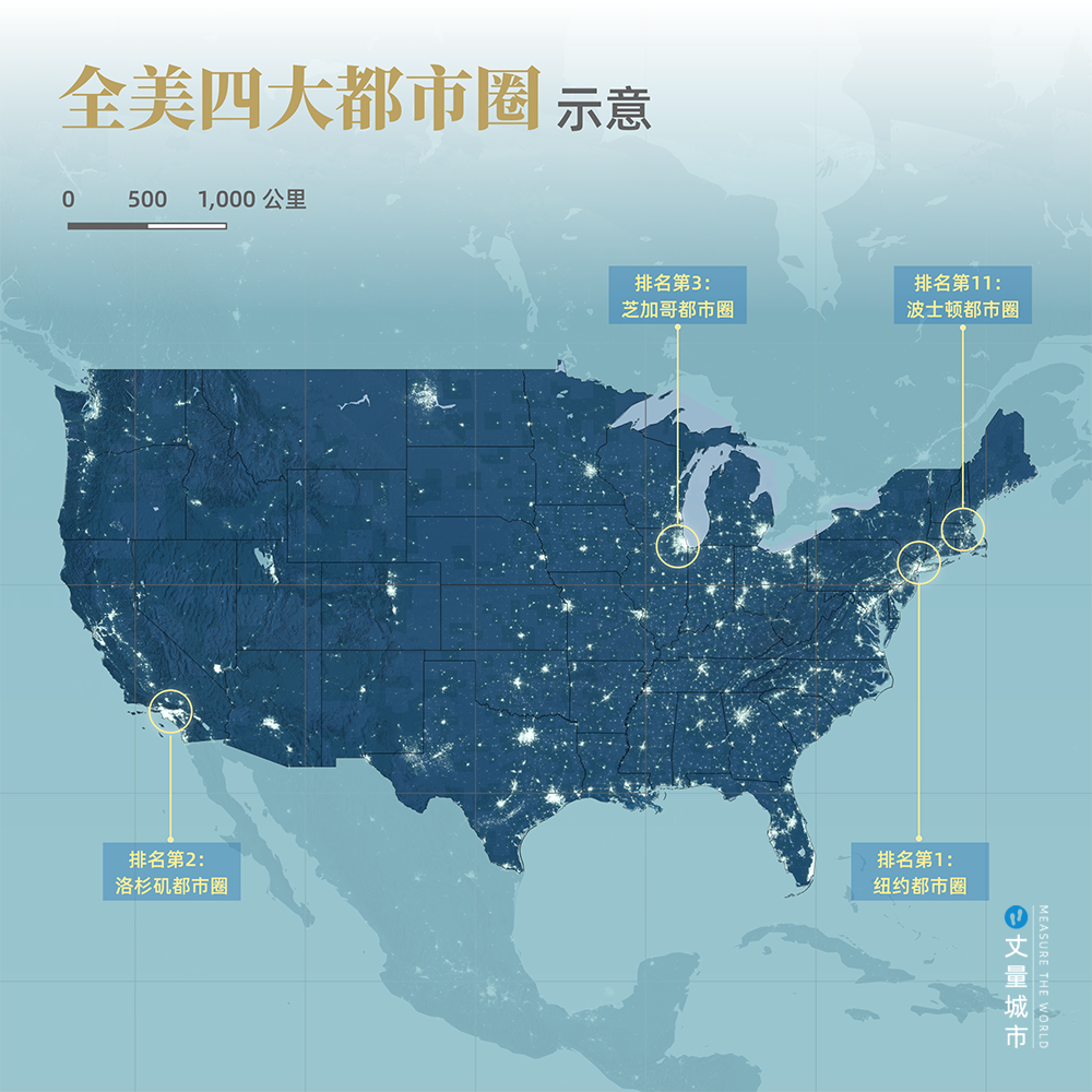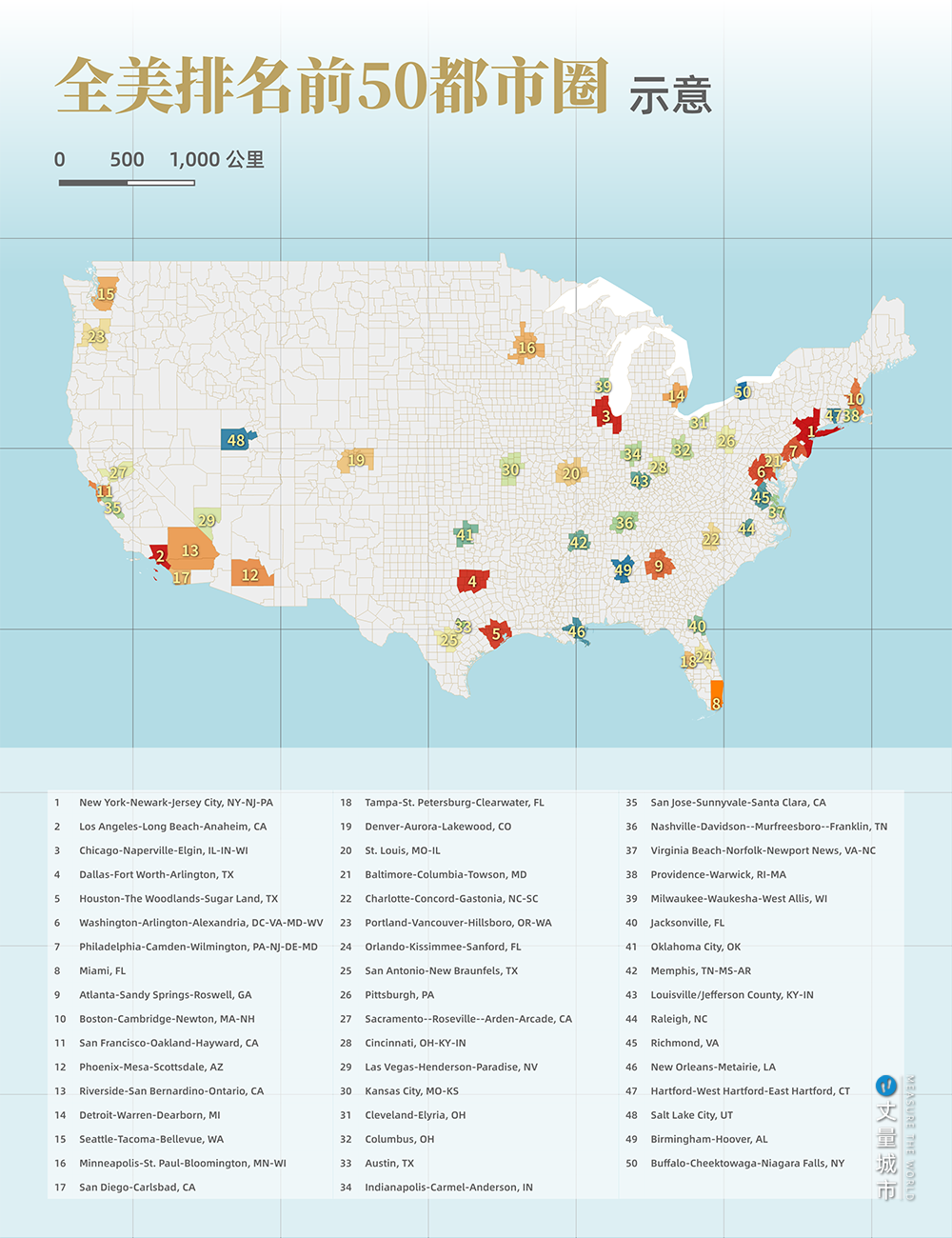 而作为大国体量的美国,根据全美2018的GDP计算,美国一半的GDP(10.3万亿美元)是由排名前24位的都市圈贡献而来。
