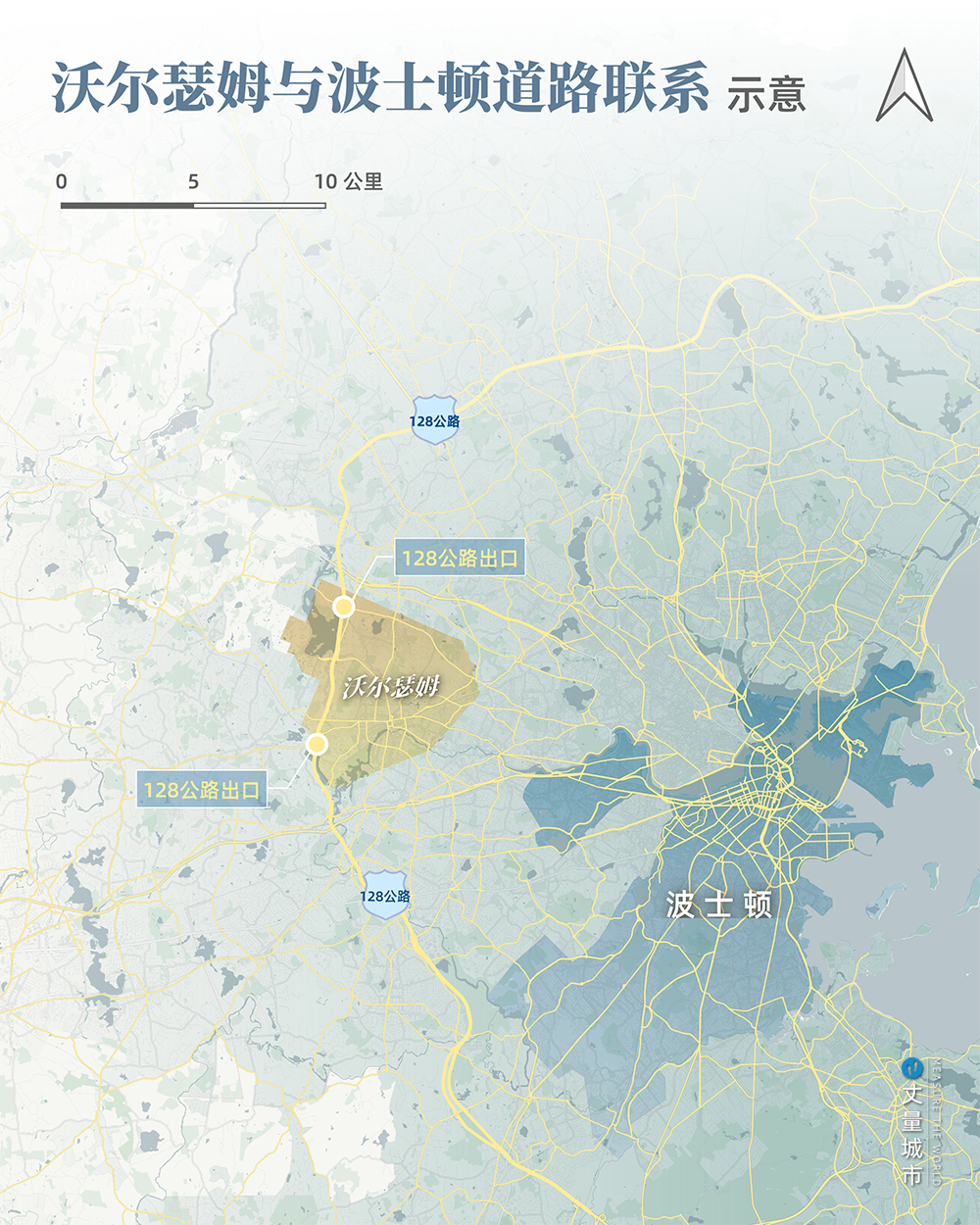 沃尔瑟姆距离波士顿只有14公里,且处于128公路和其他多条高速的交叉口。沃尔瑟姆的租金比波士顿剑桥区域要便宜40%到45%。因此,沃尔瑟姆充分利用自己的区位优势来吸引研发企业。