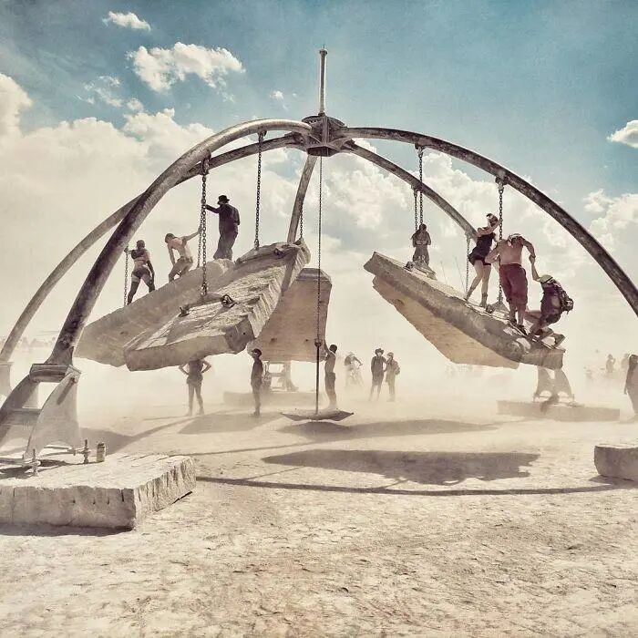 火人节起源于百年前,当时一些艺术家为了表达自我,在一个远离城市的地方重新建造一个仅存在8天的城市,之后他们会把它付之一炬,用这种创造与毁灭的方式来表达艺术与自我。