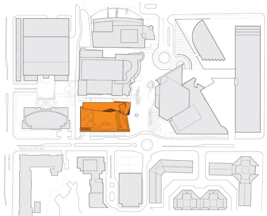 通过它,橙县艺术博物馆与艺术中心的露天艺术广场(Julianne and George Argyros Plaza)以及邻近的表演艺术中心相互连接,共同创造出一处充满感染力的户外空间,进一步吸引人们在此相聚。