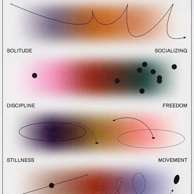 这位年轻的设计师讨论了自由职业,个人工作,心理和身体健康之间的矛盾,图形化地表达了抑郁,人格类型和自我认知的周期性。善于运用简洁的图形和丰富的渐变色彩来传递内心的想法,使用复古颗粒风格制作出一幅幅精致的平面设计作品,让作品变得高级且信息明了,充满艺术性,将平面设计的概念推广为多维和实验性的东西。