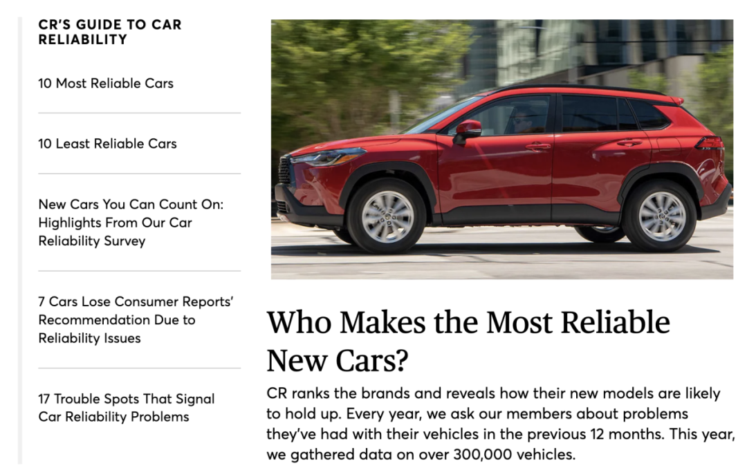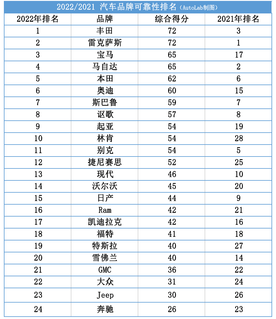 而今年《消费者报告》公布了2022年汽车品牌可靠性排名榜单,统计的数据样本依旧高达30万辆,且要求为2000款至2022款以及部分2023款的汽车。