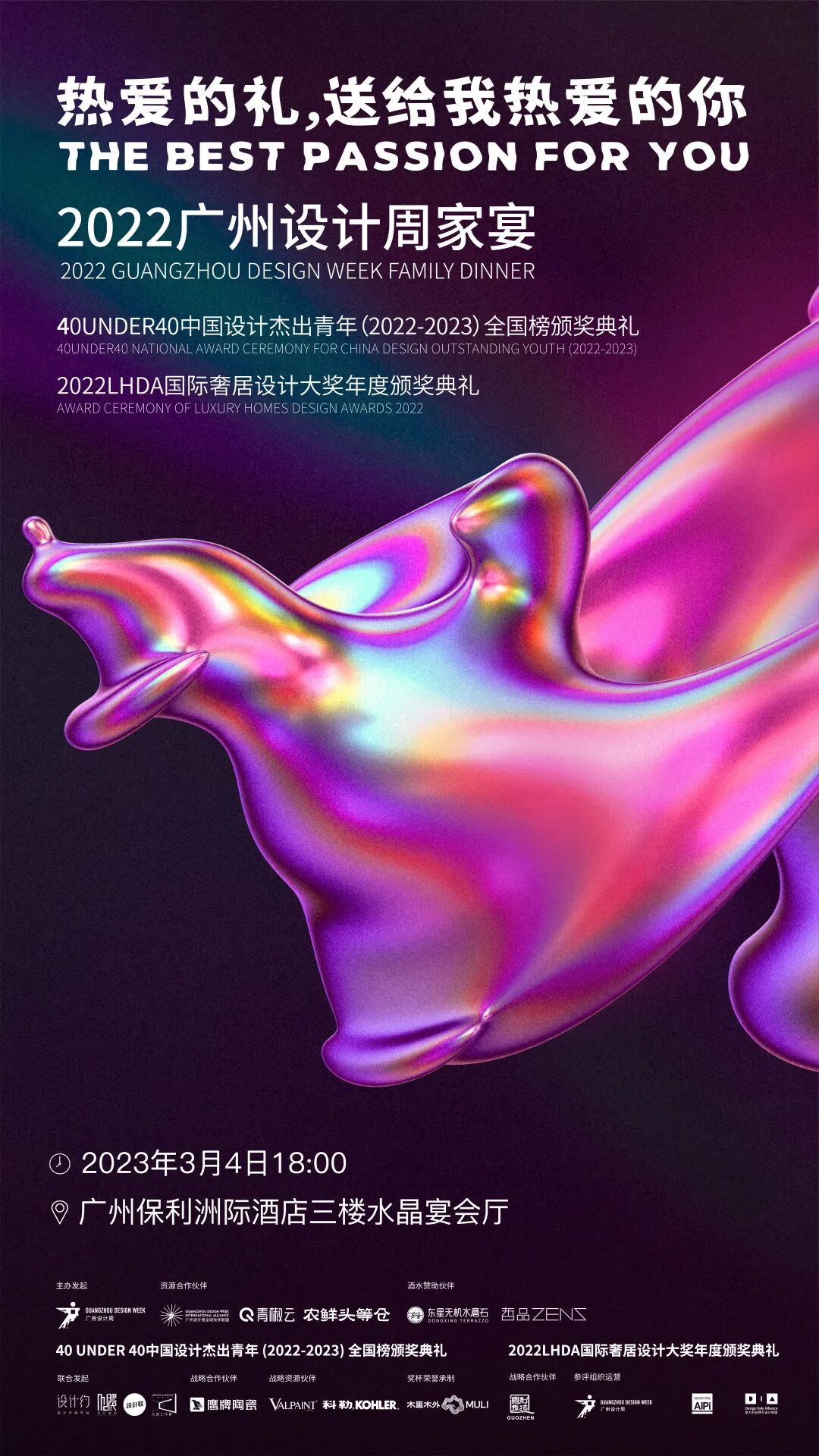 2022年广州设计周3月3日即将盛大开启。我们以“热爱的礼,送给我热爱的你”为题,于3月4日晚上l六时在广州保利洲际酒店设下家宴,特邀2022年广州设计周的重要嘉宾、品牌商、媒体、获奖者、合作机构代表共同出席。以满分的热爱,凝聚热爱之礼,献给每一个我热爱的你。