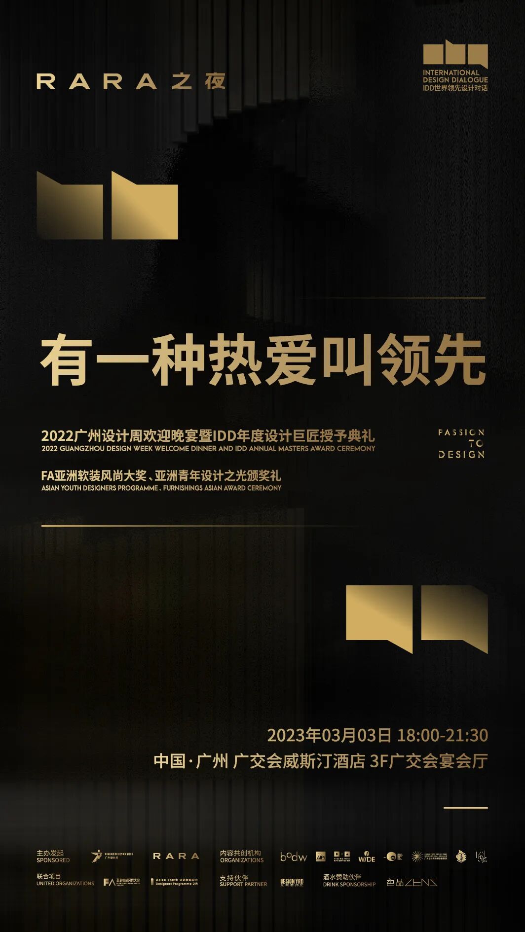 “RARA之夜——有一种热爱叫做领先”2022广州设计周欢迎晚宴暨lDD年度设计巨匠授予典礼&FA亚洲软装风尚大奖&亚洲青年设计之光颁奖礼与来自全国各地超400+特邀嘉宾欢聚一堂为领先干杯。巨匠的呼唤与近处的新声,将在此间相互呼应。