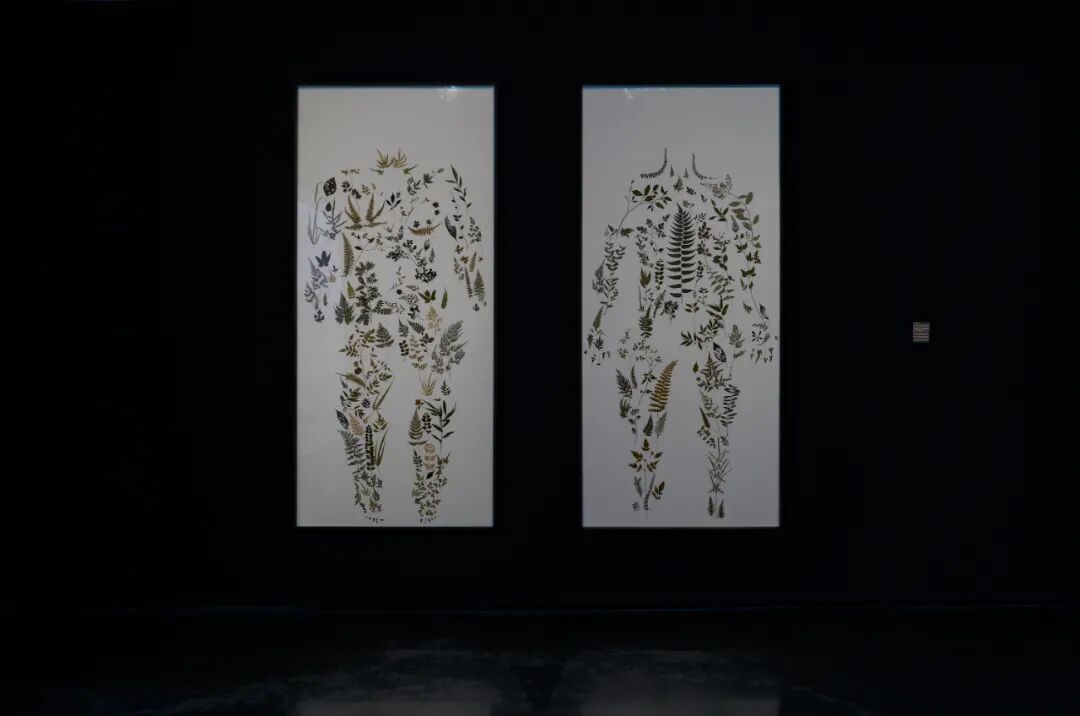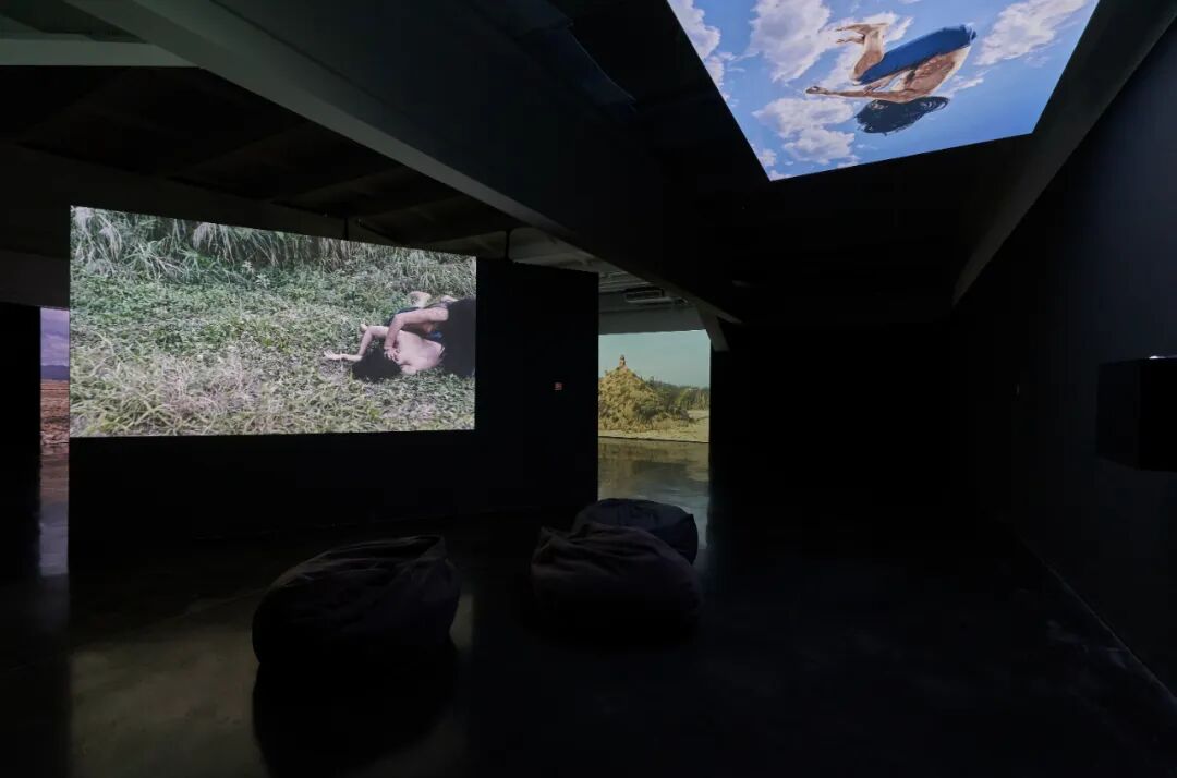童文敏在此前对城市废墟的考察中,关注到野生植物的生存韧性,并开始收集生长于不同地域的植物。她通过漫长的日晒过程将这些植物纹印于自己的全身,仪式性地赋予身体以植物的灵性。展览中的六组影像作品记录了艺术家印晒有植物纹路的身体从云南西双版纳勐海县曼召村向北开启的一系列行为表演,夜晚爬到山里的树枝上,倒挂在颠倒的大树拂过土地,与人绞杀,在与一群人在火堆前感受温度原地旋转等等。这些近似放空的情景实则是艺术家在经历身体的适应、对本地知识的学习和对自然环境的考察后获得的影像结果,而这些前期准备亦可被看作是延时性的创作。艺术家的身体既是图像也是媒介,占据了出神与在场之间的临界空间,平衡不可避免的自我政治化的同时,在朴素神秘的层面中寻找意义。
