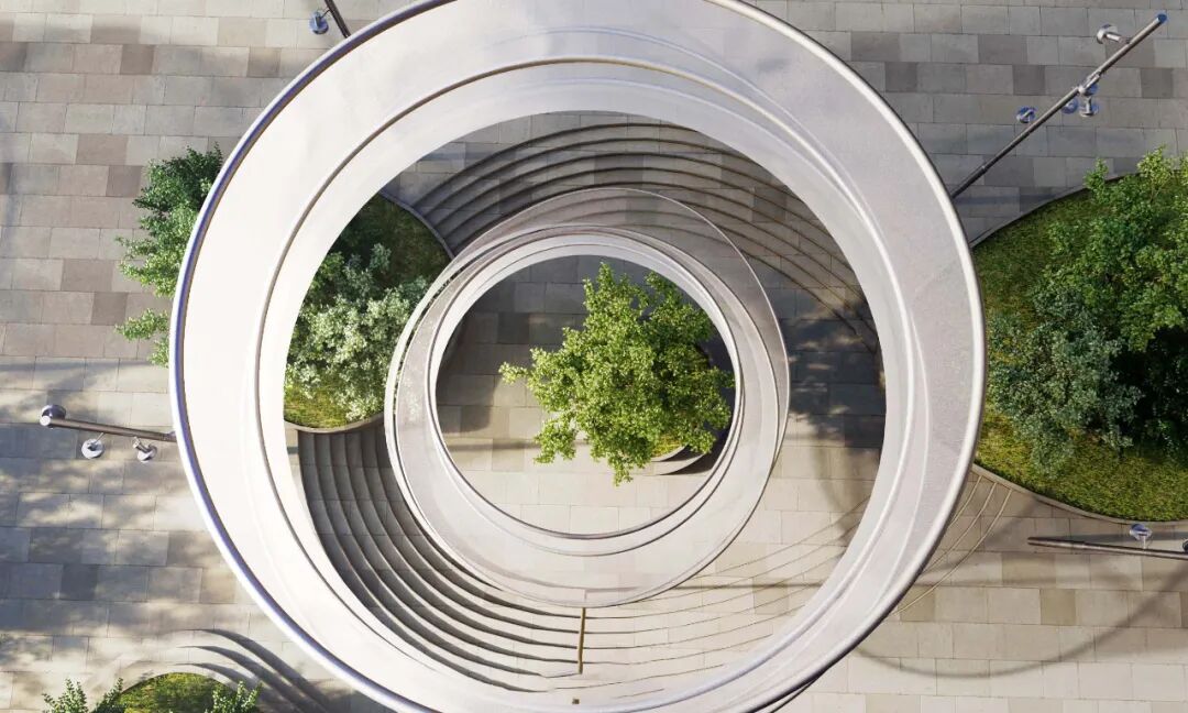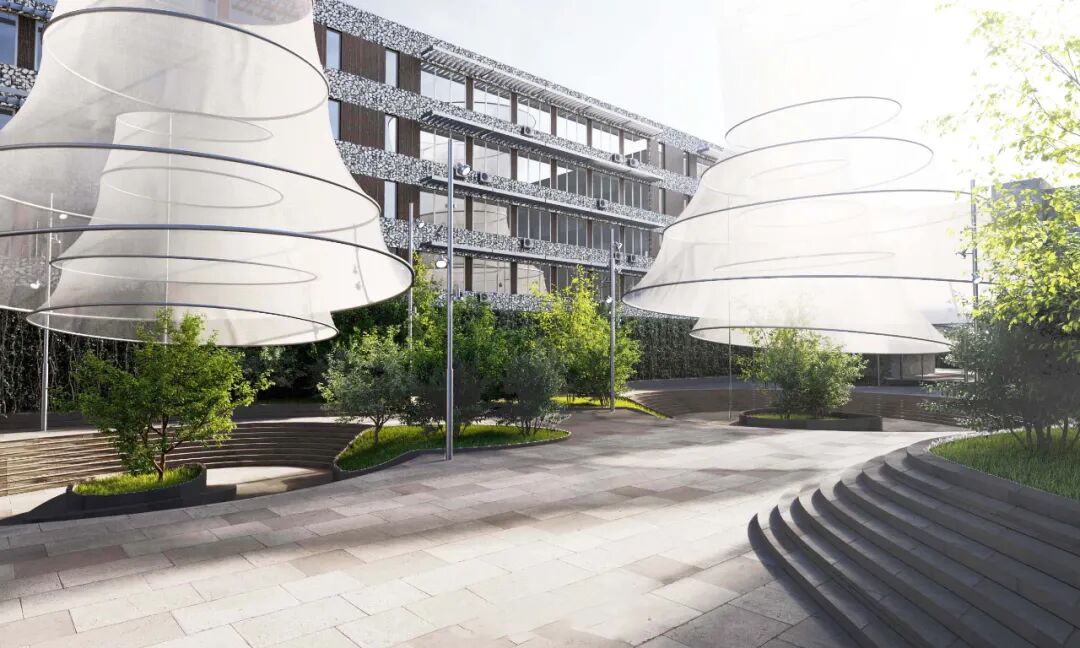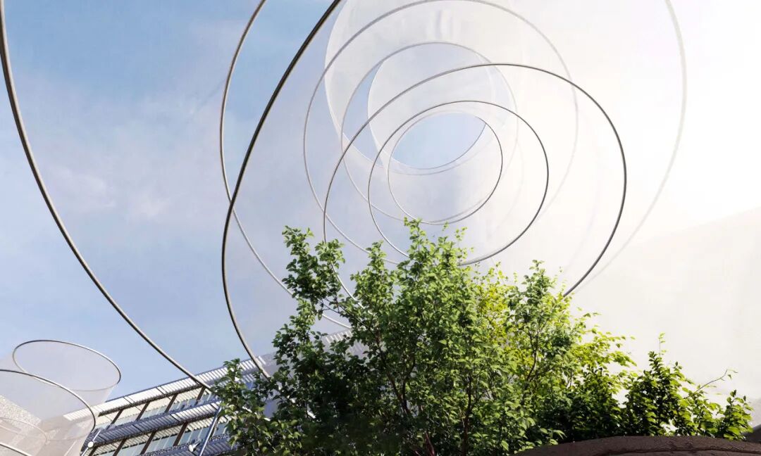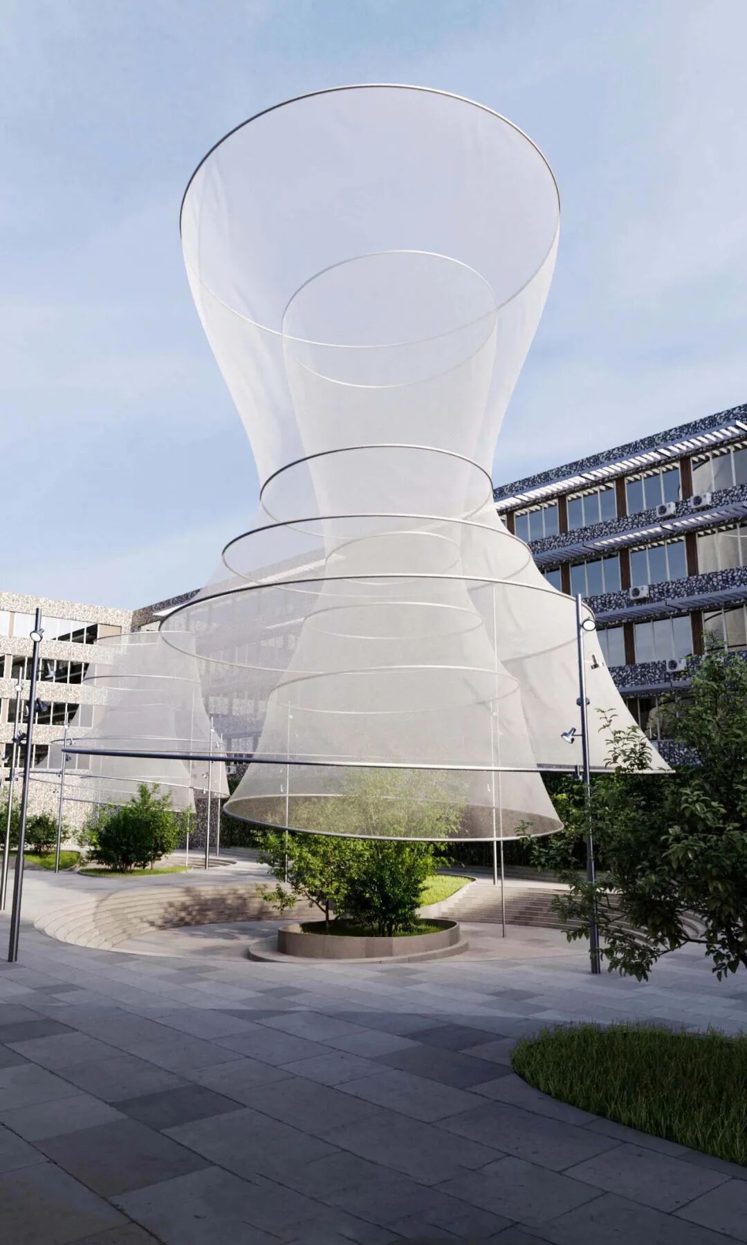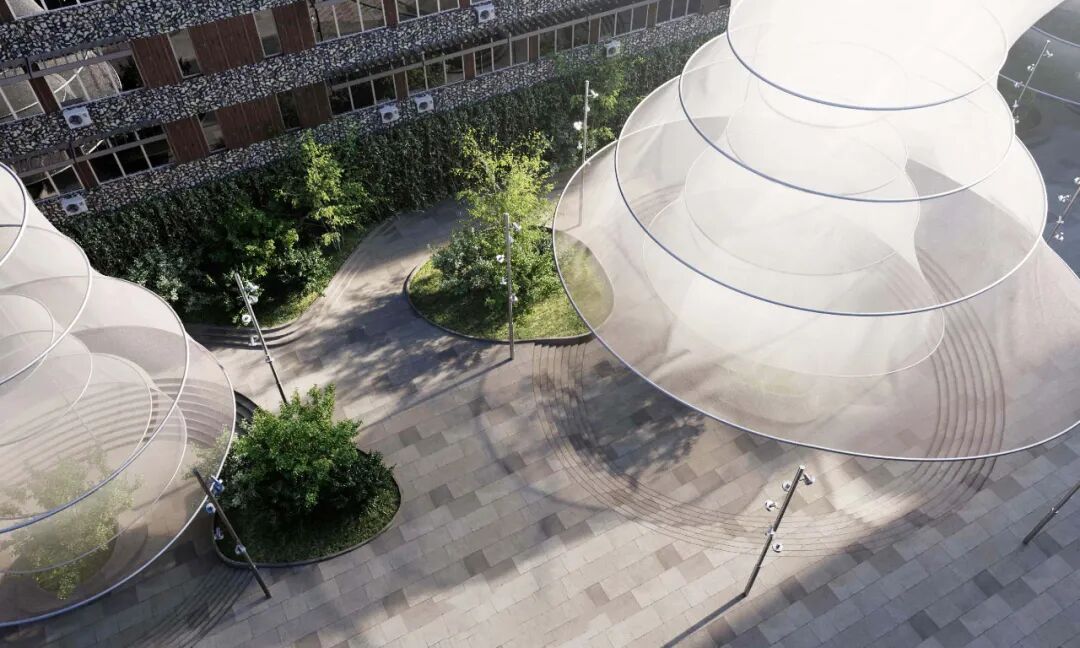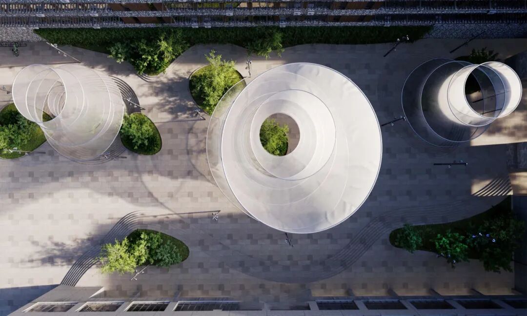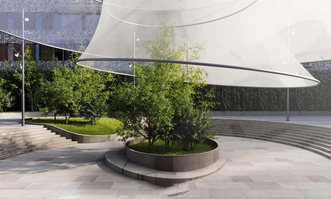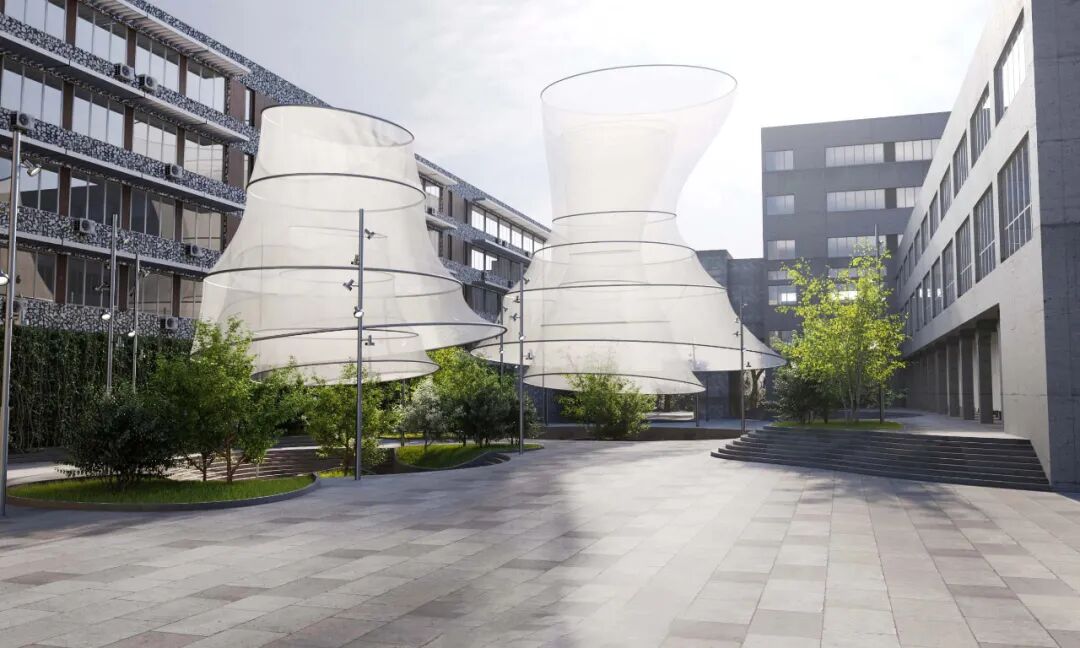 项目中心由三个圆柱形的装置组成,该装置由织物和金属制成,悬挂在电缆上并固定在垂直的金属管上。构图的建筑和设计将保护人们免受烈日的暴晒,并创造出光影具有冥想和愉悦的氛围。每个装置下都将设有一个小型圆形剧场,以突出构图并为喜欢在非正式场合用餐的人们提供一个空间。