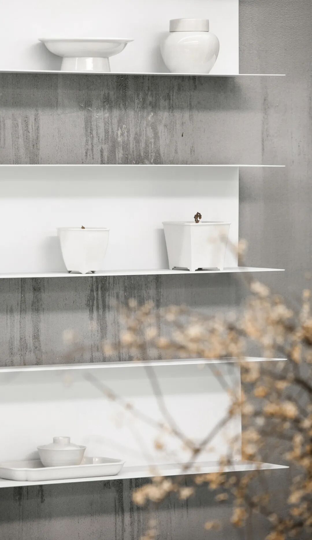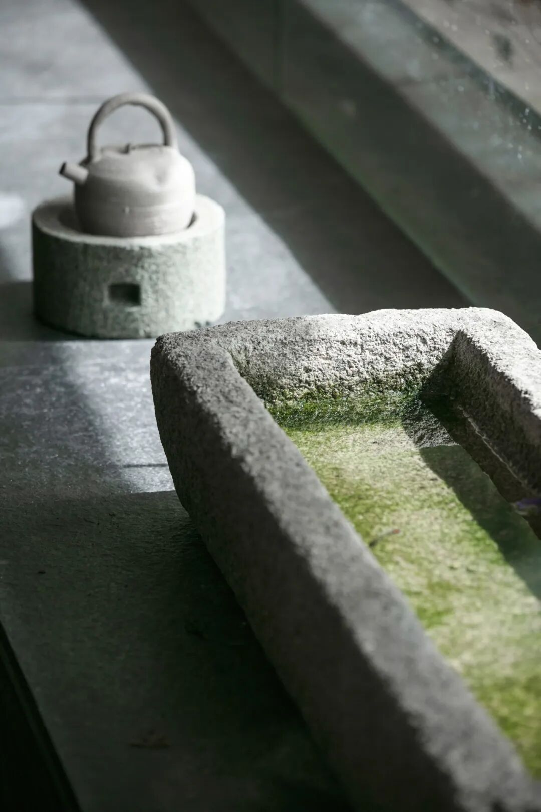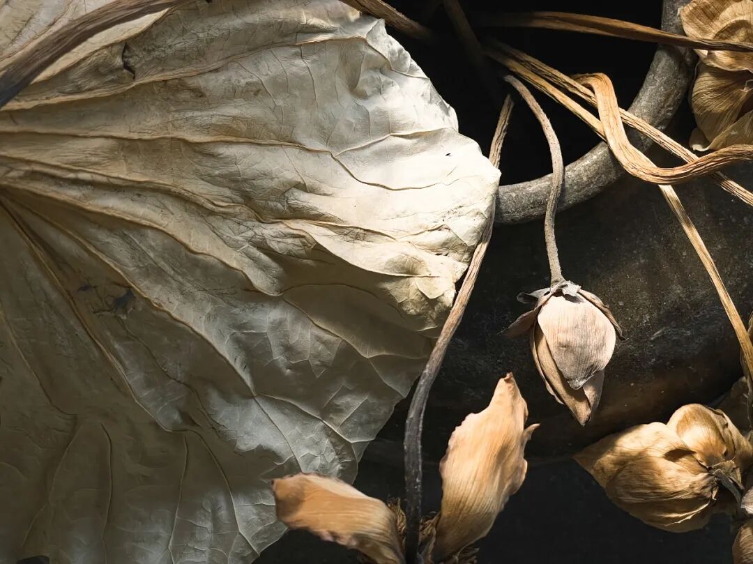 空间中的每一件旧物,都曾经拥有过沛然的生命力,在时间的流逝之中成为留存美好记忆的标本,不经意流露出的侘寂意味亦是一种独特的脱俗、静美。瓷器的残缺一角、石台的磨损印记、枯荷的过季形态、水槽的伴生青苔......一切美得不循常规,仔细观照,黯淡中有生活的况味。