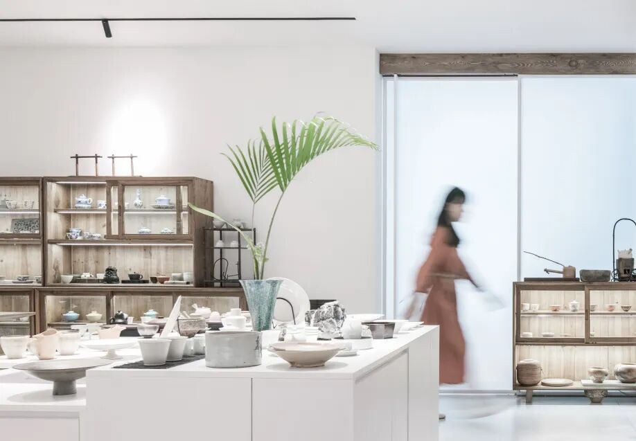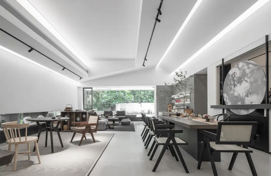 “社区运营的闭环,需要打通商业业态、邻里社群和在地文化之间的复杂逻辑。”透过自然的借景、艺术的框景,整个茶空间未有隔断,而划分出不同茶事的互动深度 —— 独品得神,对啜得趣。在古朴茶案周边,围炉对饮的场景气氛与氤氲茶汤同时升腾;偏安一隅的静谧场域则为人们独自品味留有余地;宽阔玻璃窗景前的沙发区,无疑是绝佳的与自然共饮地,在万象沉淀中阅见自我,或是与朋友小聚,静物无言,而彼此相契。
