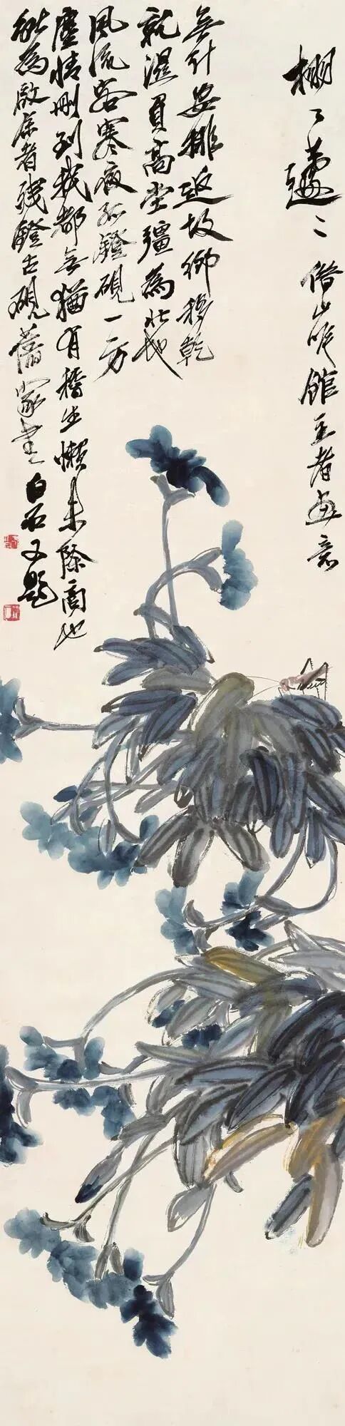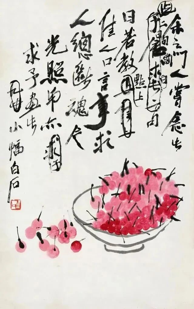 衡诸两千年之画史,齐白石越明清而穿宋元,不知有汉,何论魏晋,非一朝一代一家一门可牢笼,独示心语,简约天成,挚情浓出,俗中显雅,其一空千古之概在此。其慕青藤而去其荒率,崇八大而远其奇怪,羡石涛而无其淋漓,尚金农而勿取其孤狷,师缶翁而易之以明洁,此吾不赞同以晚近而低视白石之论调者也。