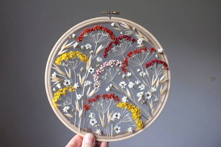 她将干花、保鲜花和其他植物性天然材料,与薄纱面料相结合,在直径不到20厘米的刺绣箍上,刺绣出一系列精致、精美的3D花朵刺绣作品。正因为如此,奥尔加·普林库的作品也被称为干花刺绣。