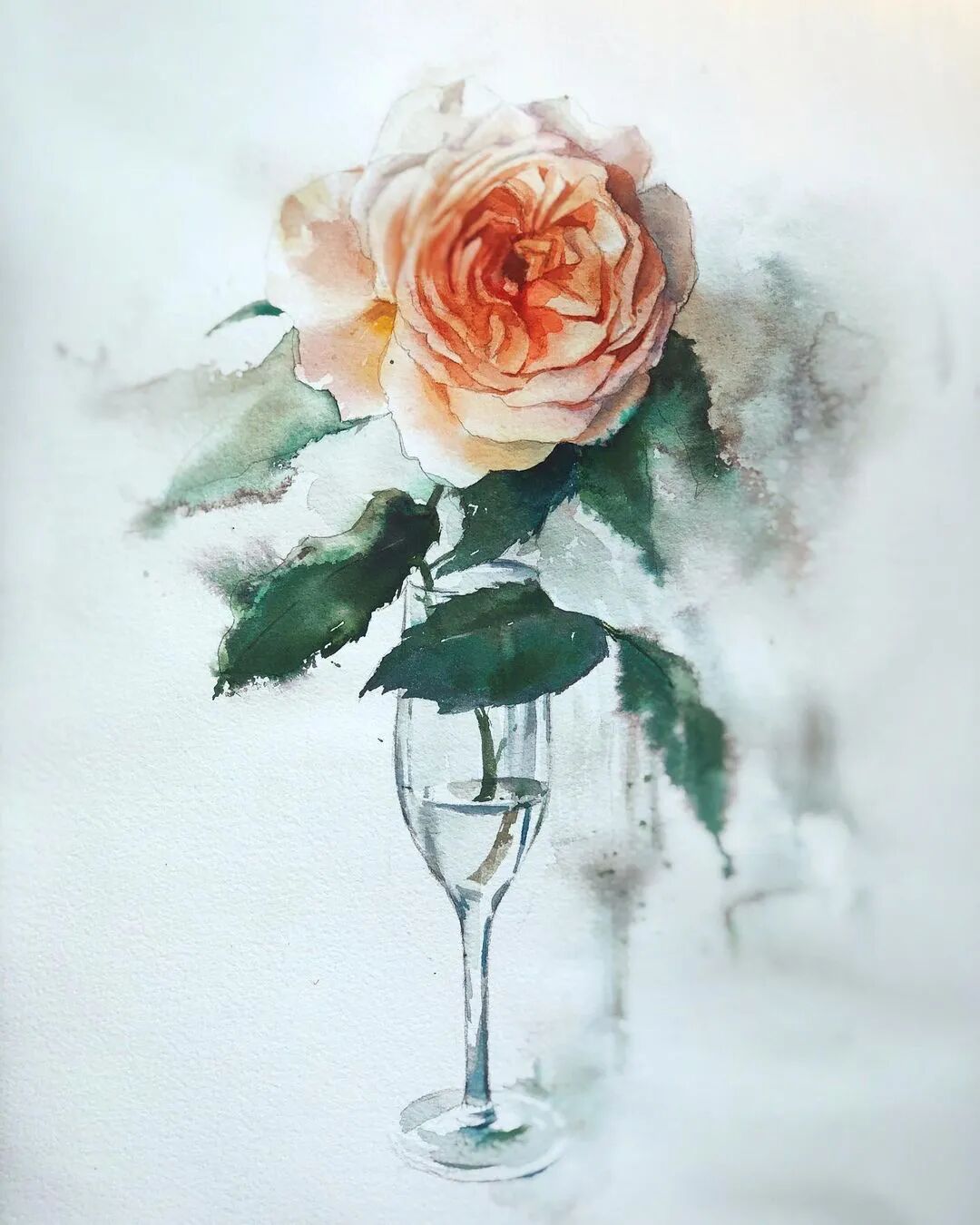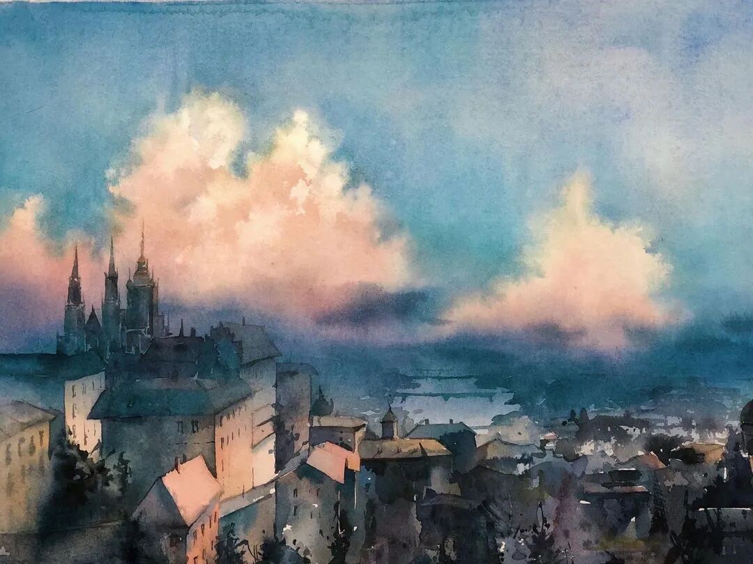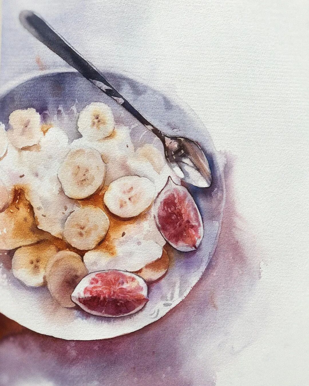 但是,这并不妨碍她的作品还是带给我们明亮通透的感觉,层次感和空间感分明,梦幻、空灵、清澈,迪娜·莱普琴科娃的水彩画主题非常多,有动植物,自己吃过的美食,以及旅行期间遇到的建筑等等,甚至,她还把自己穿婚纱的样子画了下来。