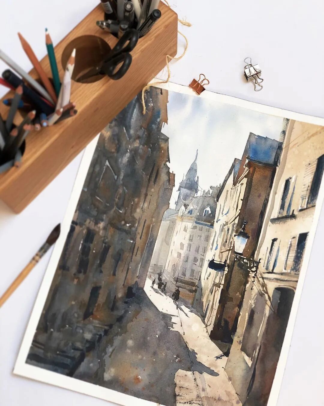 这是一位会将自己的日常生活,画成水彩画分享给大家的艺术家,从她的作品中,我们可以看到关于她的家庭、日常生活,以及旅游经历等等,迪娜·莱普琴科娃是一个色调大师,在她的水彩画中,我们很少看到饱和度很高的色彩,反而能看到极强的深度和视角,光影关系营造出的明暗对比,也是一绝。