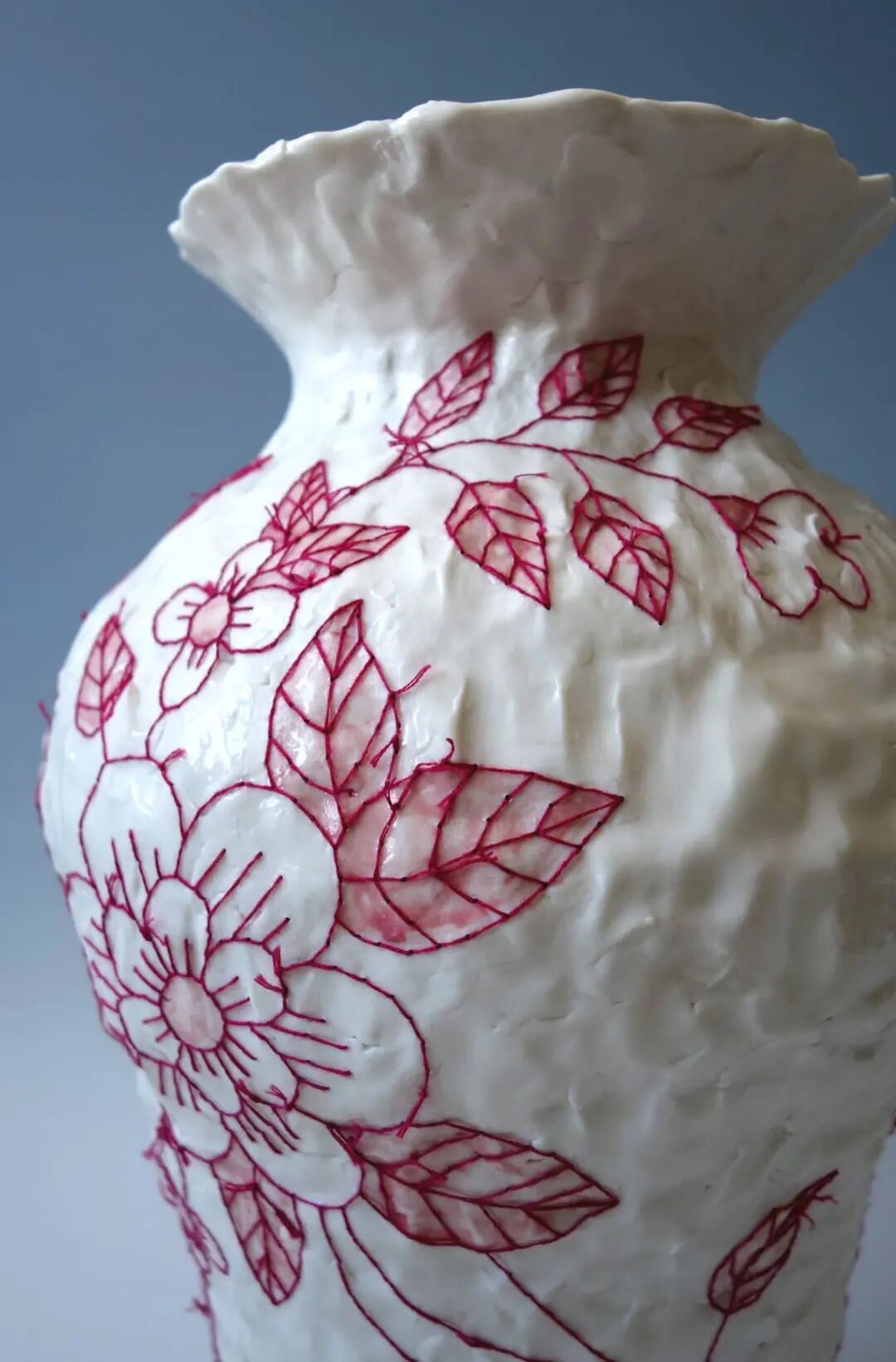 其实,这跟手劲儿大小没什么关系,卡罗琳·哈里斯在陶瓷花瓶的瓶身上,先用器具打出小孔洞,这些孔洞的大小刚刚足够让线穿过,再进行下一步的“刺绣”,就是通过这种方式,她让刺绣的花朵图案在花瓶上“绽放”。