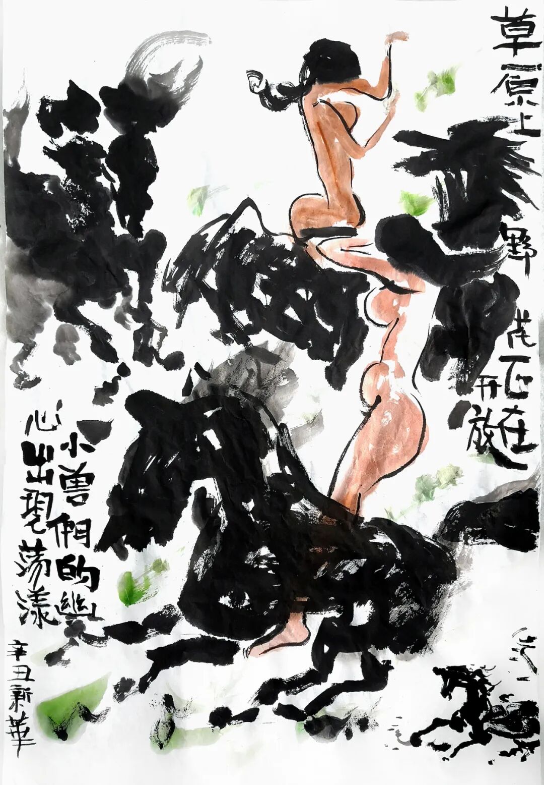 美女与野兽是一对奇妙的组合,也是笔墨的组合。笔墨的刚与柔、粗与细、婀娜与刚猛,组合起来就是交响乐。