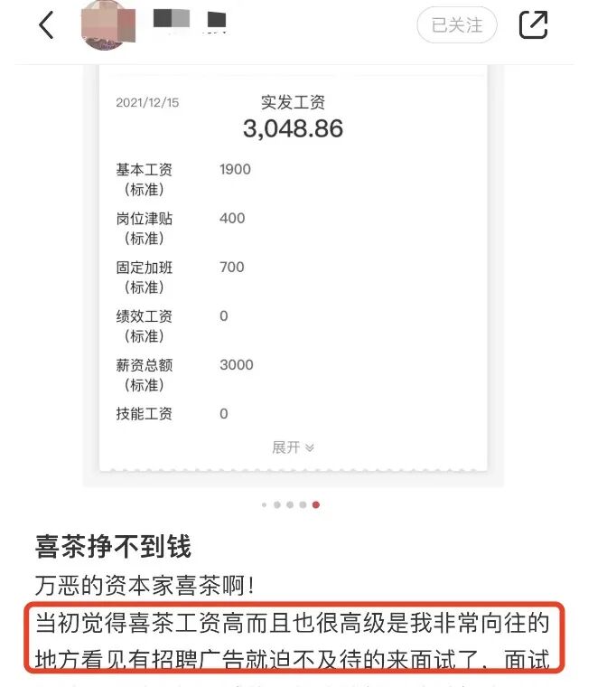 上述小红书博主也表示,自己2021年6月份入职喜茶,三个月实习期满转正之后,就没拿过一次完整的工资。“其中十月和十一月是由于疫情原因没法上班,十二月份本来应该发全勤,到手应该有3700-4000元,但最后只发了3000元。”