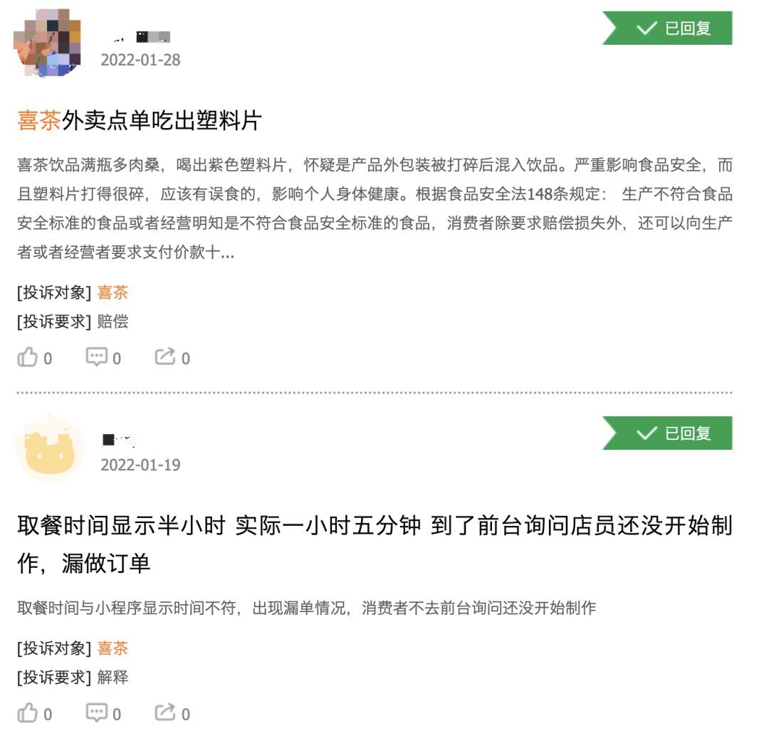 作为茶饮品牌,食品安全问题也是行业一大隐忧。黑猫投诉显示最近两条是关于在喜茶外卖吃出塑料片,以及取餐时间过长的投诉。