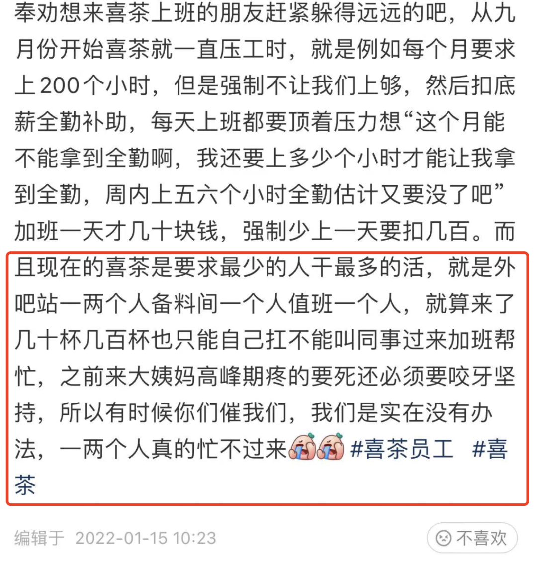 除了收入减少外,她提到,喜茶从9月份开始一直在压工时。“例如每个月要求上够200个小时,但是强制不让员工上够,月底扣薪全勤补助等。”