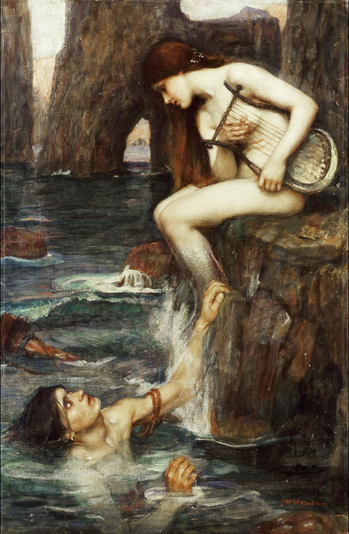 在《奥德赛》里,在海上航行的人, 听到塞壬的歌声就会为它着迷, 引起种种愁绪, 宁愿投海也要寻觅她们, 最后将命丧于辽阔的大海无法返回故乡。