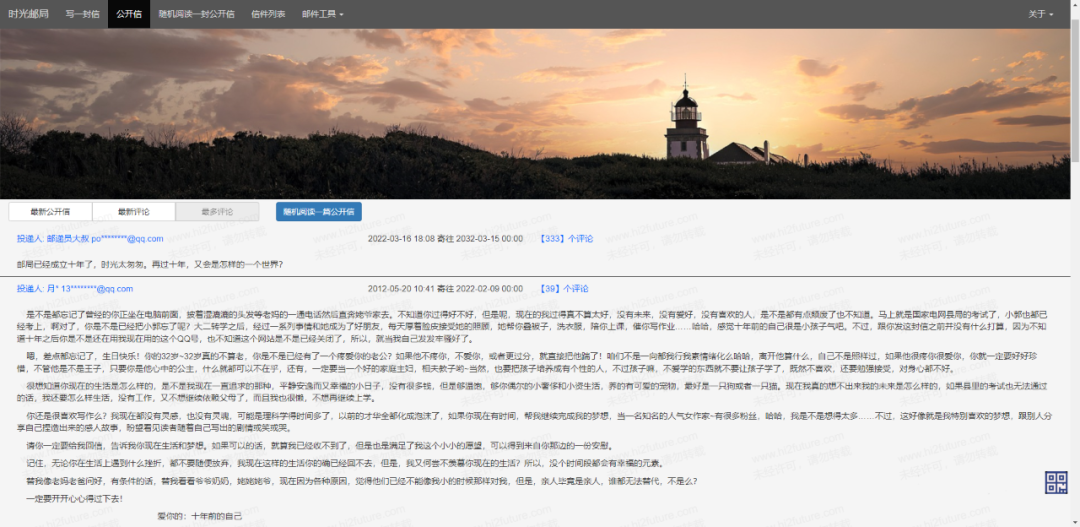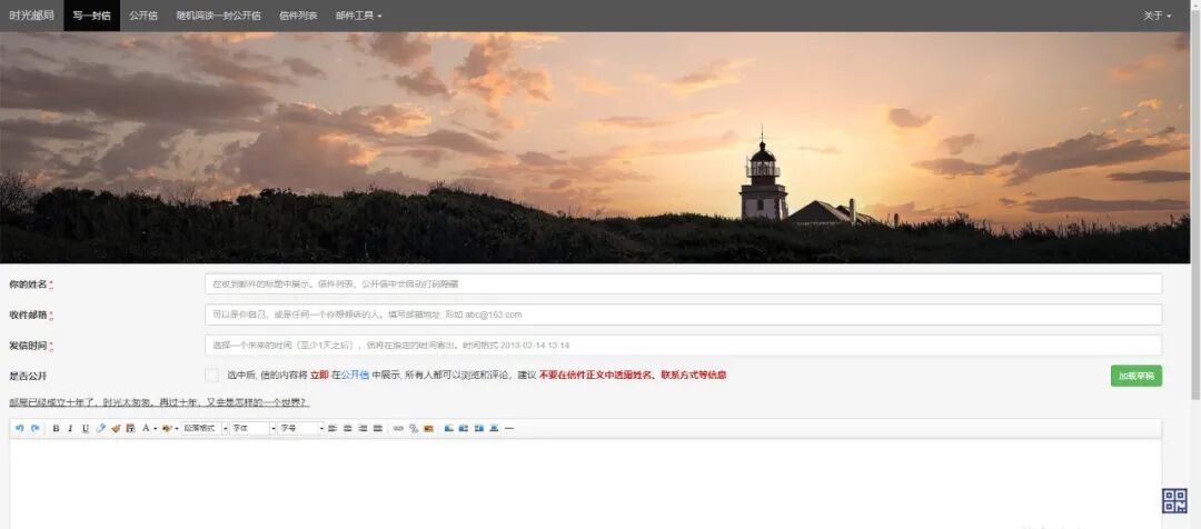 这是一个极具情怀和浪漫的网站。在这里,你可以给未来的自己或那个Ta写一封永不过期的信。填写你的名字、收件邮箱、发信时间,再附上信的内容,就能发送成功了~时光邮局会按时将你的信送到未来。截止目前,这个网站已经运行了10年132天,共投递邮件30万9111封,待投递21万3262封。在公开信专栏,你也能看到其他人写的信件,里面记载了太多人的人生。如果你也有话想对未来说,那么现在就开始写吧。多年以后,当你收到来自旧时光的信件,那种感慨之情,一定会让你难以忘怀。