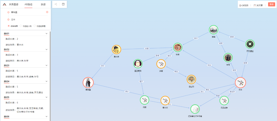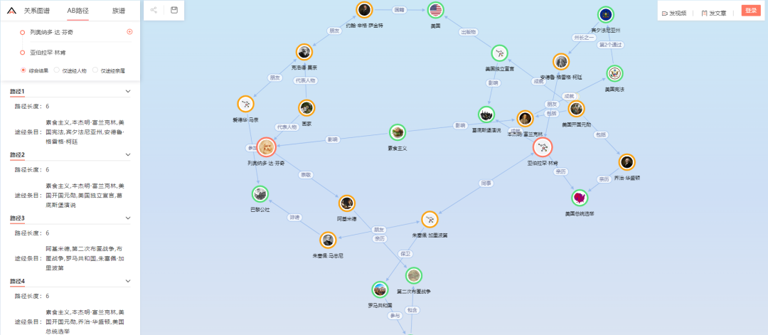 功能一:AB路径,如果我问你:林肯和达芬奇是啥关系?秦始皇和日本啥关系?你肯定一脸懵逼?但是「AB路径」就可以回答你。任意输入两个名人名字,就会生成一张关系图谱,那些八竿子打不着的人也能给你扯上关系。如下,林肯和达芬奇的关系,以及秦始皇和日本的关系。