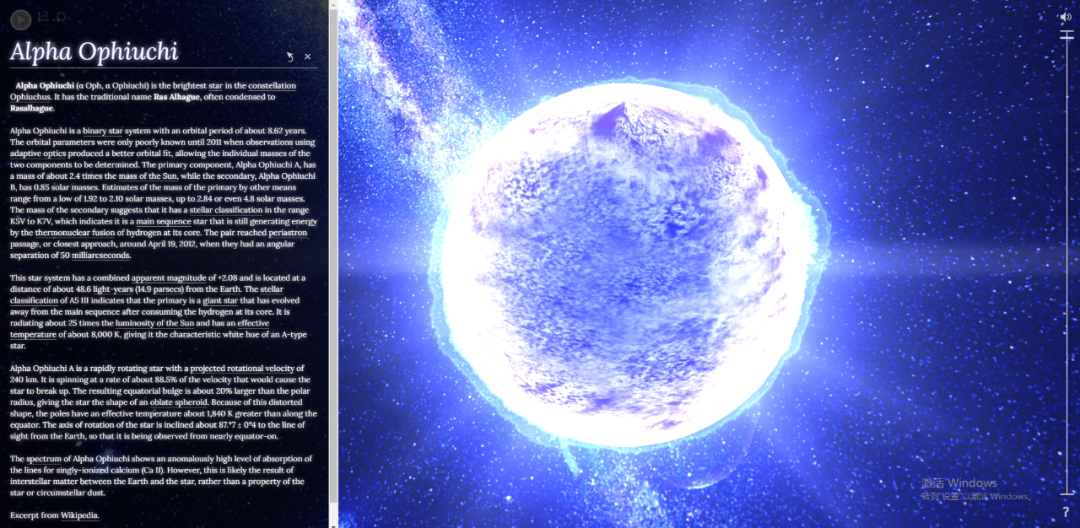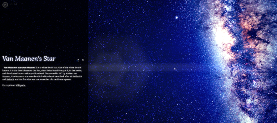 如果你喜欢天文,这个网站强力推荐给你。这是一个在线星图网站,你可以近距离观察到10几万颗星星。拖动右边的线条,你可以放大视野,所呈现的璀璨星河,视觉效果惊艳。也可以缩小视野,近距离观察每颗星球的细节,旁边标有对应的名称和介绍。