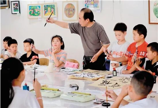 华蓥市一名书法老师,在向青少年儿童讲解毛笔的正确执笔姿势。游伍琼/摄
